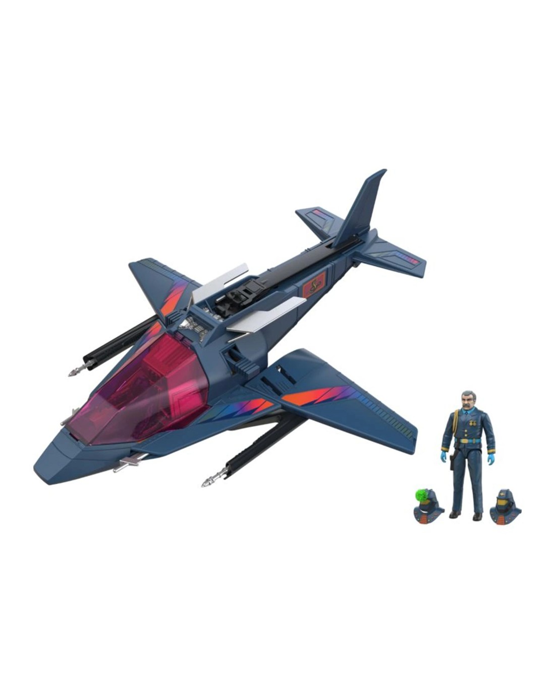 The HTH (High Tech Helicopter), makes a bold return—reengineered by The Loyal Subjects with massive firepower. This fearsome dual-mode aircraft, piloted by Miles "Wolf" Mayhem, converts from stealth helicopter to high-speed jet fighter in just a few simple steps. Armed with dual laser cannons, hidden missile launchers, and a Shockwave Shell drop feature, HTH is a weaponized juggernaut in the fleet. With its sleek 13" frame, 1-foot wingspan, spinning rotors, and fiery Sidewinder Missile FX, this beast was built for domination in the skies. Mayhem comes fully equipped with his VIPER mask—capable of firing corrosive blasts in the original animated series—and a detailed pilot cockpit with room for mission-ready figures. Ages 8 +