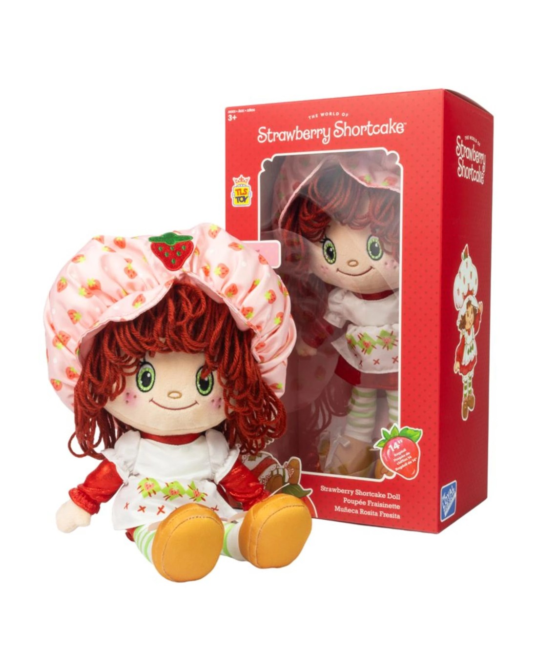 A delightful sweetly scented 14-inch rag doll style soft plush Strawberry Shortcake doll! This charming doll is a perfect tribute to the original retro Strawberry Shortcake dolls which continues to be loved by generations!Made with high-quality materials, this Strawberry Shortcake doll features a soft, huggable body that is perfect for snuggling up with at bedtime or playtime. Her adorable outfit is designed to resemble a strawberry-themed dress and hat, complete with green stem accents and polka dot berry patterns.But what really sets this doll apart is the irresistible scent of fresh strawberries! Just like the original Strawberry Shortcake dolls from the 80s, this doll emits a sweet, fruity aroma which is undeniably irresistible! Ages 3 +