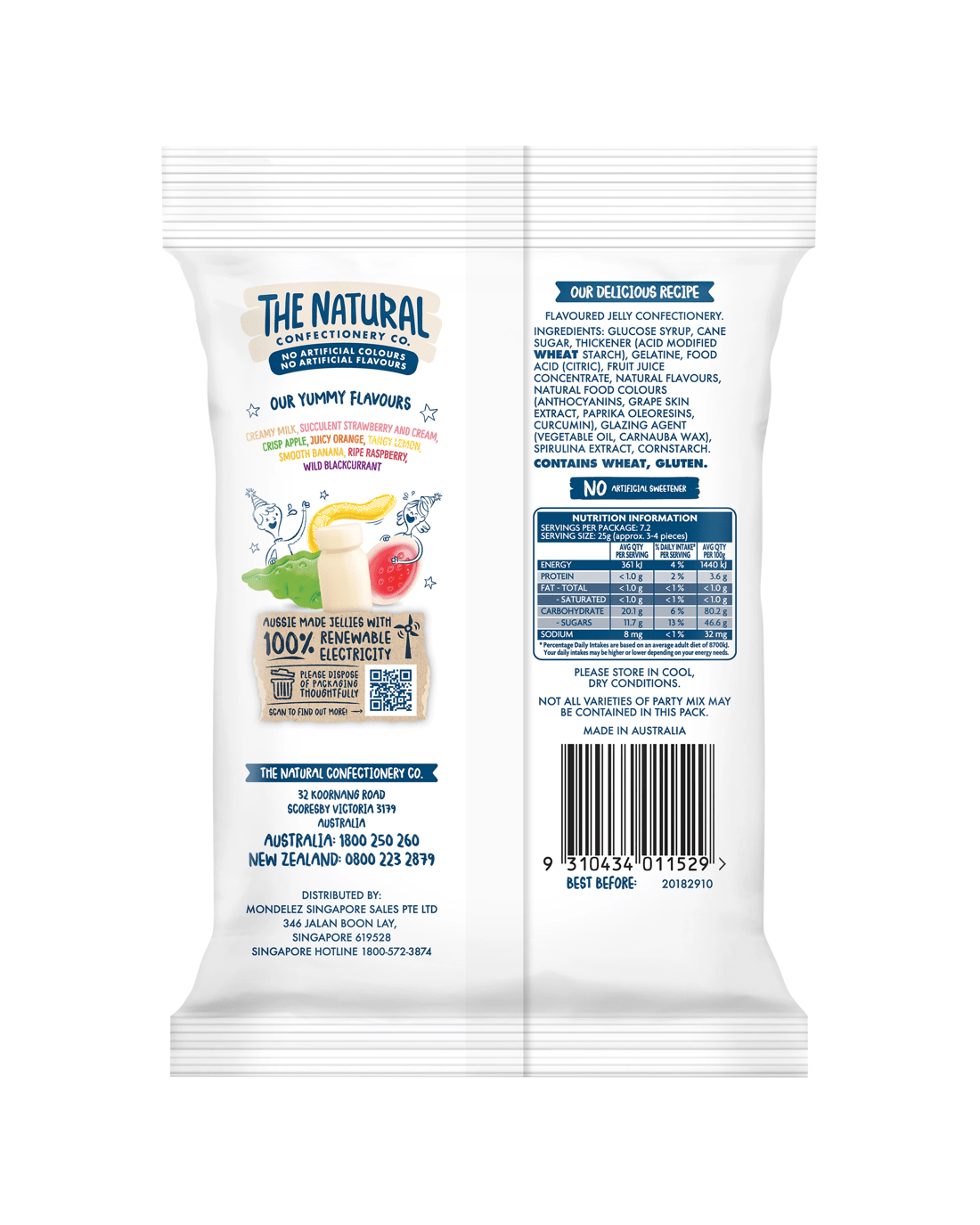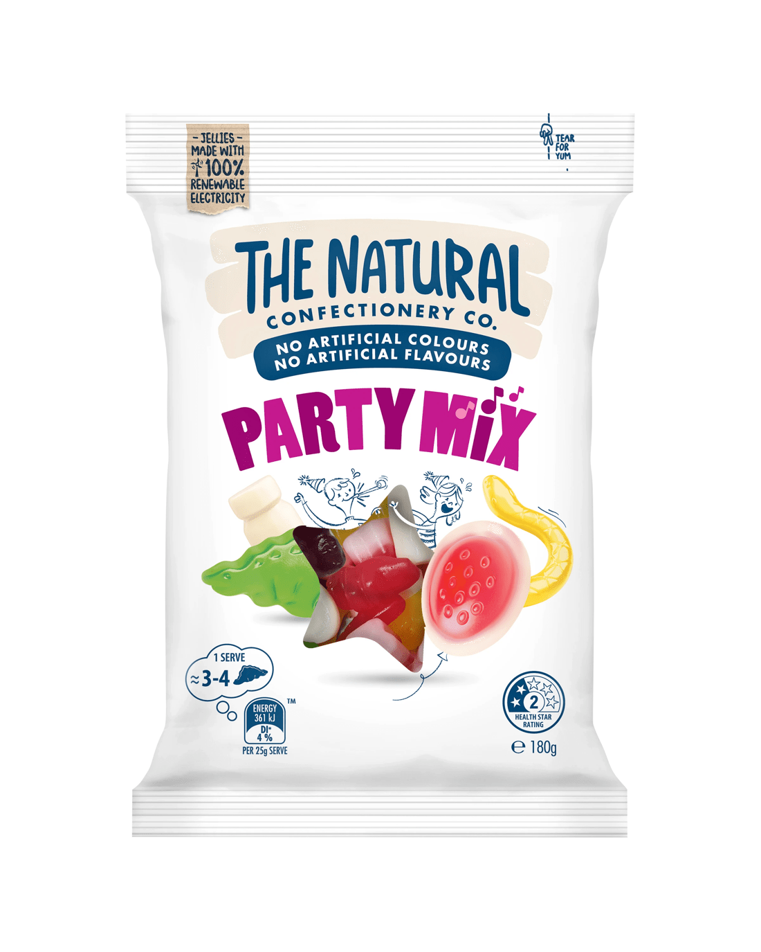 Let's Party! The Natural Confectionery Co. Party Mix are a party for your taste buds. Aussie made and packed full of deliciousness, with no artificial colours, no artificial flavours, no GMOs and no artificial sweeteners.
