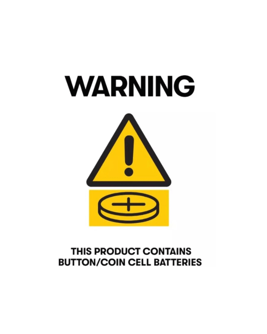 WARNING: THIS PRODUCT REQUIRES/CONTAINS BUTTON CELL BATTERIES TO OPERATE. BUTTON BATTERIES ARE HAZARDOUS TO YOUNG CHILDREN IF SWALLOWED. KEEP OUT OF REACH OF CHILDREN AT ALL TIMES. PLEASE REFER TO INSTRUCTIONS.