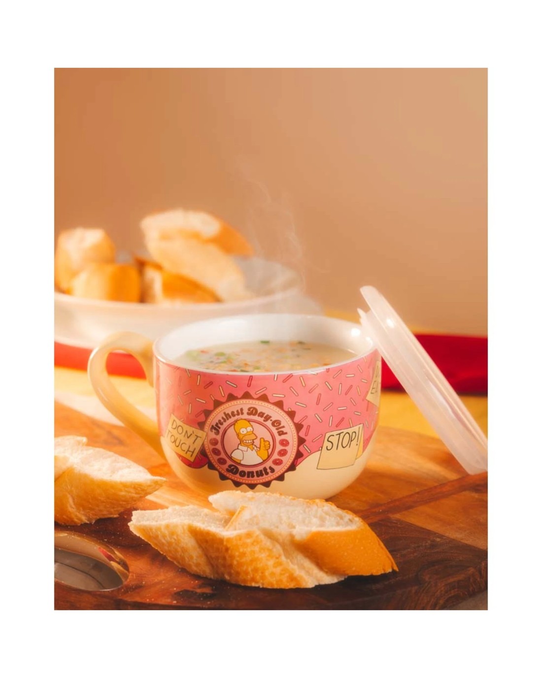Dine in style with this Freshest Day-Old Donuts Soup Bowl with Lid. Featuring a sprinkling of donut-themed chaos and Homer's unmistakable appetite warnings, it brings the fun of Springfield straight to your table.