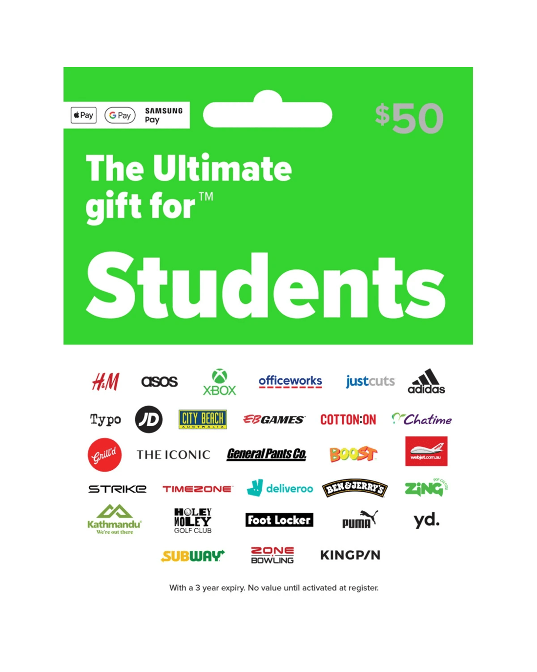 - Note: 3-year expiry. No value until activated at a register