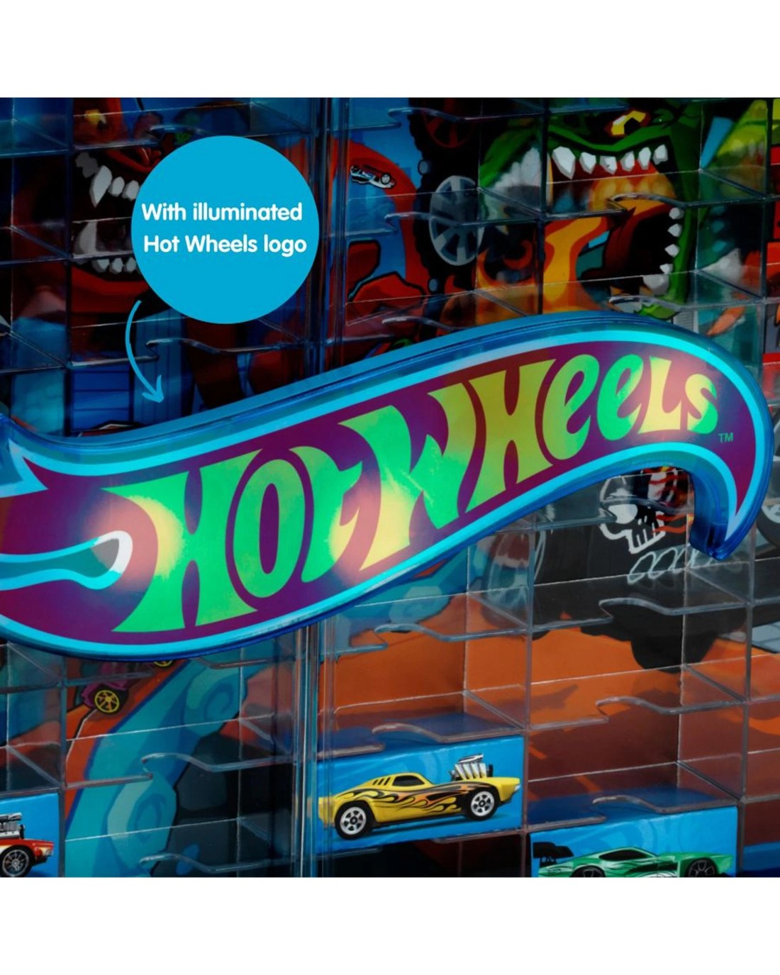 Hot Wheels - Collector's display case with lighting, with storage compartments for up to 54 cars, 1:64 (vehicles not included) Hot Wheels logo with lighting 2-leaf transparent display case door Cool poster in Hot Wheels City Creature design as a background Collector's display case can be attached to the wall using commercially available, suitable screws and plugs (screws and plugs not included) Dimensions: 58 cm x 9.4 cm x 43 cm Ages 3 +Item Specifics