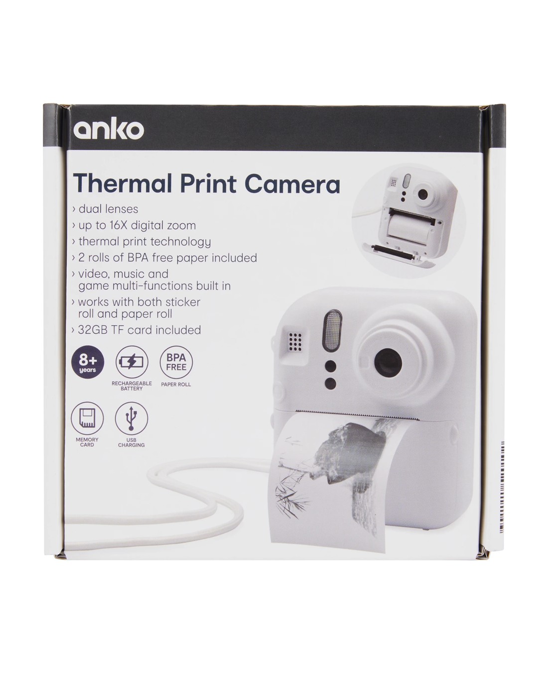 - Includes 1 x camera, 1 x charge and data cable, 1 x lanyard, 2 x thermal paper rolls, 1 x 32GB memory card and 1 x instruction manual