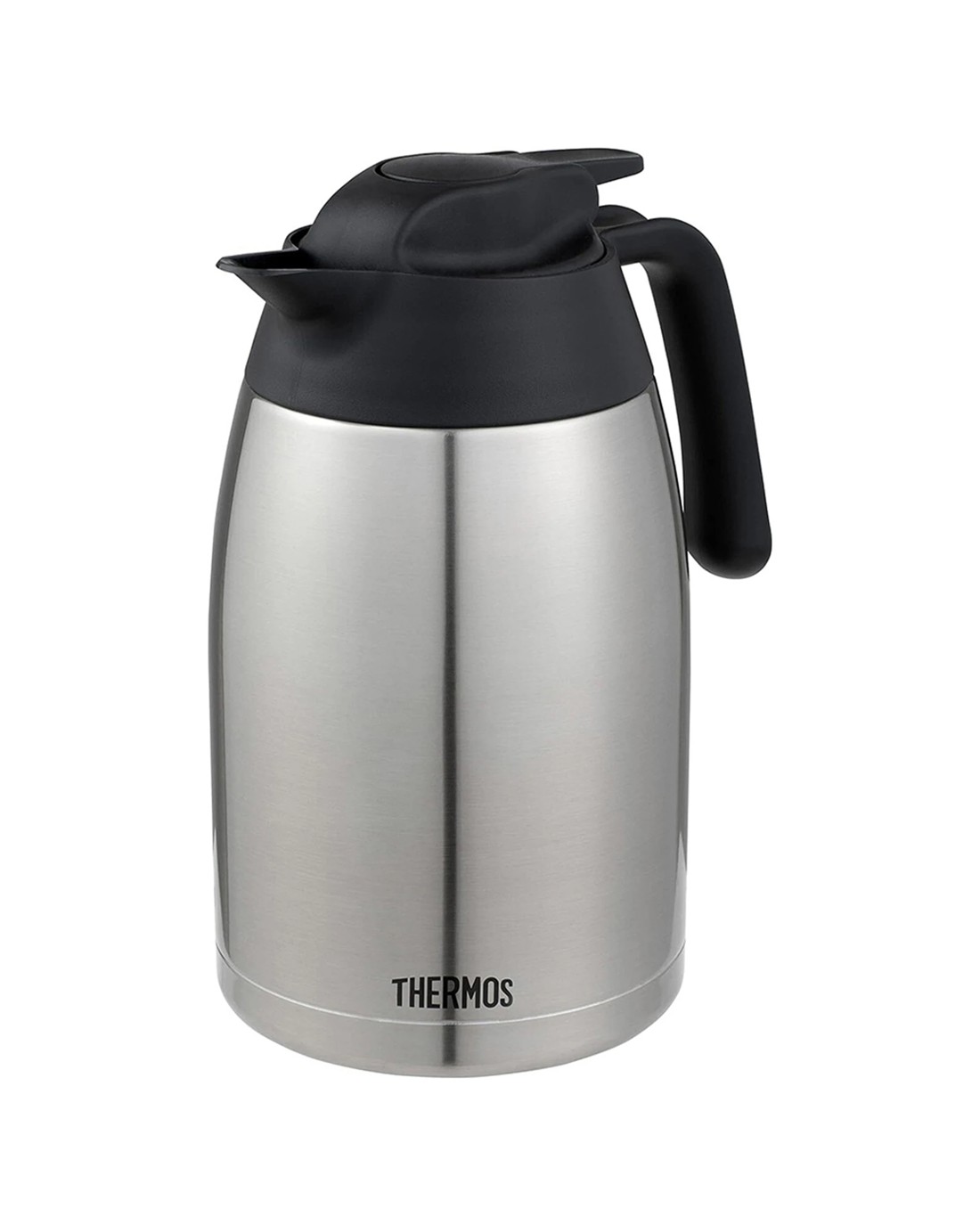 Thermos Vacuum Insulated Carafe: Keeps it hot, keeps it cool! With Thermos vacuum insulation, this carafe is a temperature retention champ. From piping hot coffee to refreshing cold beverages, it's got your back. Built to last with a durable stainless steel interior and exterior, this carafe is as tough as it is stylish. Say goodbye to burnt fingers and pesky condensation, because it's cool to the touch with hot liquids and sweat-proof with cool ones. Pour with precision and ease thanks to the sturdy ergonomic handle and convenient one push stopper. No more spills or struggles, just smooth pouring action. And when you're on the move, this carafe won't weigh you down. Lightweight and portable, it's ready for any adventure or gathering.