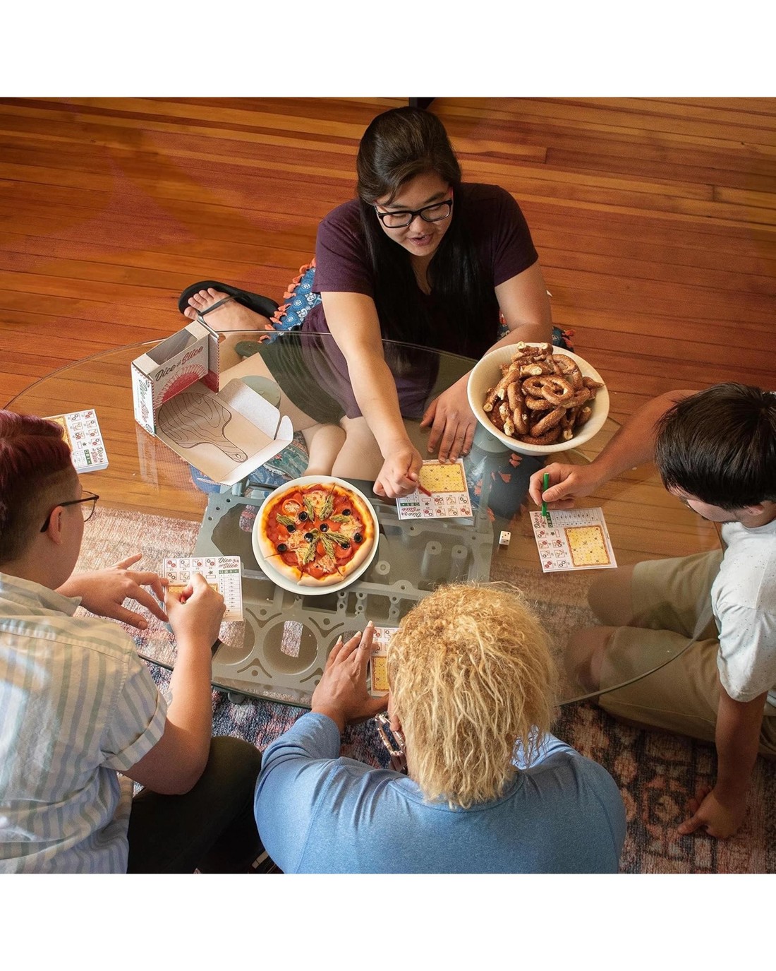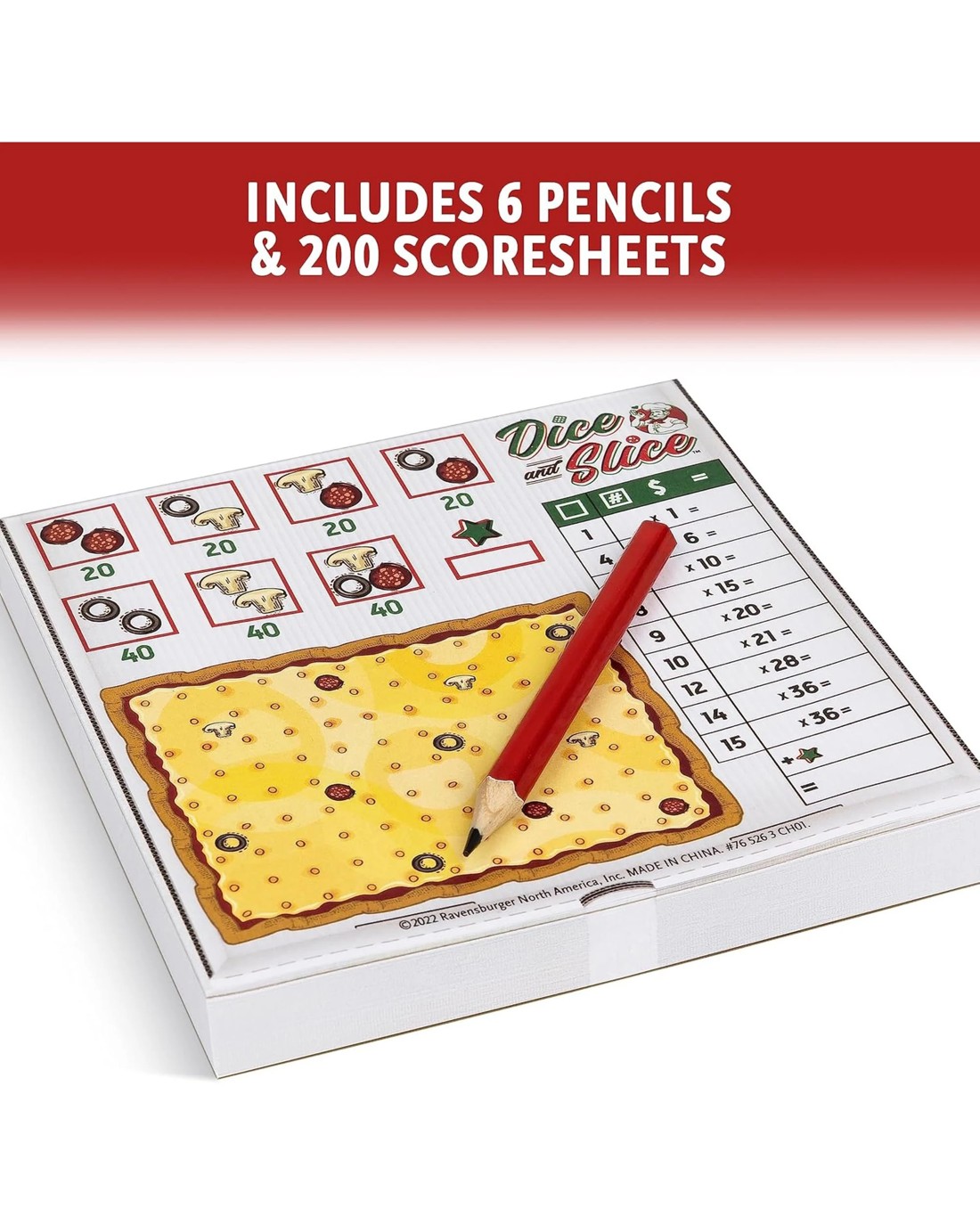 Why just eat pizza when you can play with your food? This isn't just a game--it's a pizza party in a box!! Welcome to Dice and Slice the hottest, most scrumptiously strategic dice game to ever come fresh from the oven. In Dice and Slice, it's a flavorful frenzy as players roll to dice and slice the largest pieces on their scoresheet. No other game lets you pit your mind and wit against friends, family, or pizza-loving strangers. Strategically take the dice you want and assign the other to players and bonus points scored for toppings included in slices. Dice your scoreboard up to the largest slices to win the most points, Perfect for family game night, a pizza party with friends, and all dice game lovers. You'll knead this game on your shelf faster than it takes to order extra cheese. Get ready to serve up some sizzling strategies because victory is a dish best served hot! Disclaimer: Any scoresheets cannot be consumed no matter how big and delicious they look. If you try to eat anything, we suggest you order a real pizza! Ages: 8+ | 2-6 Players| 30-60 mins