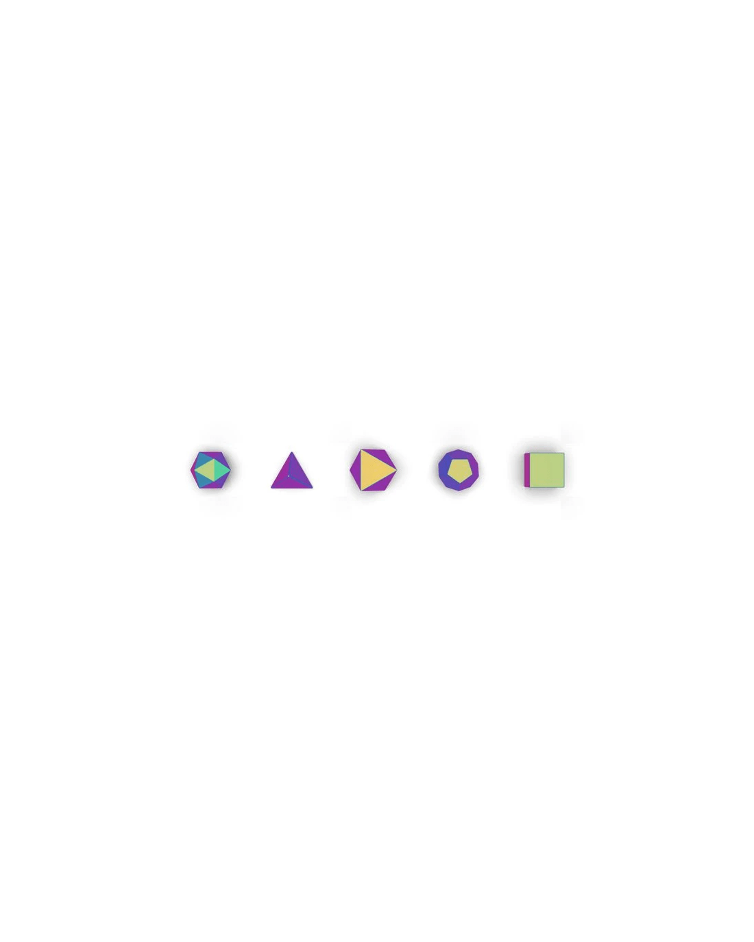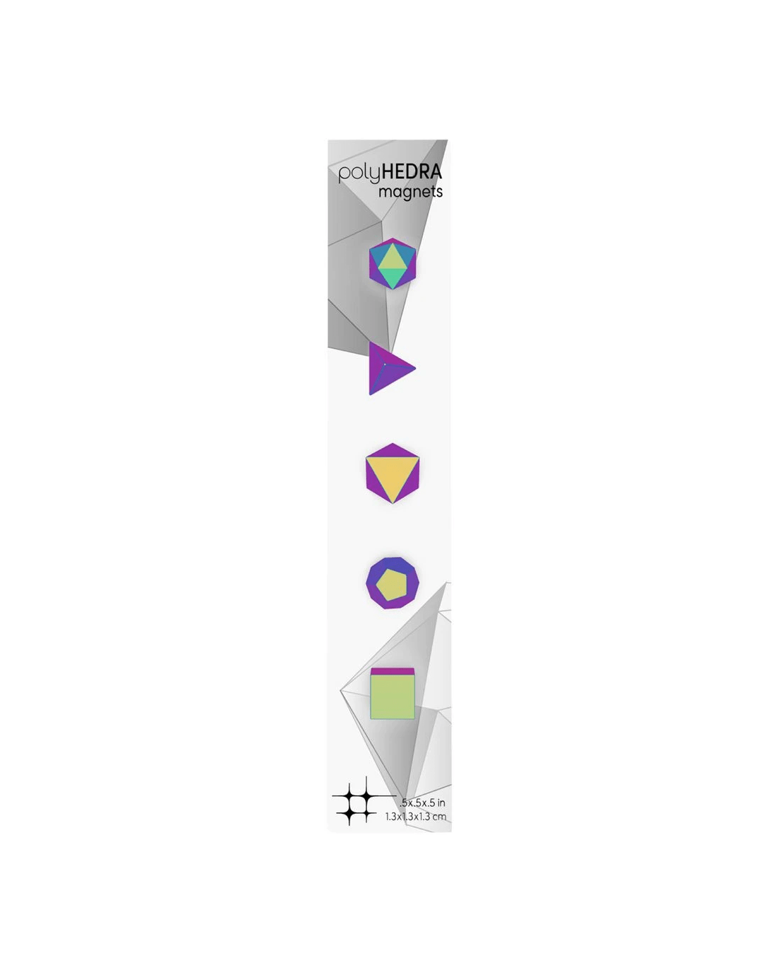 Use these Three By Three Polyhedra Magnets to add dimension to metal surfaces. The five mathematically proportionate forms - tetrahedron, cube, octahedron, dodecahedron, and icosahedron - are backed by superstong mighties® magnets that let you shape up any space.