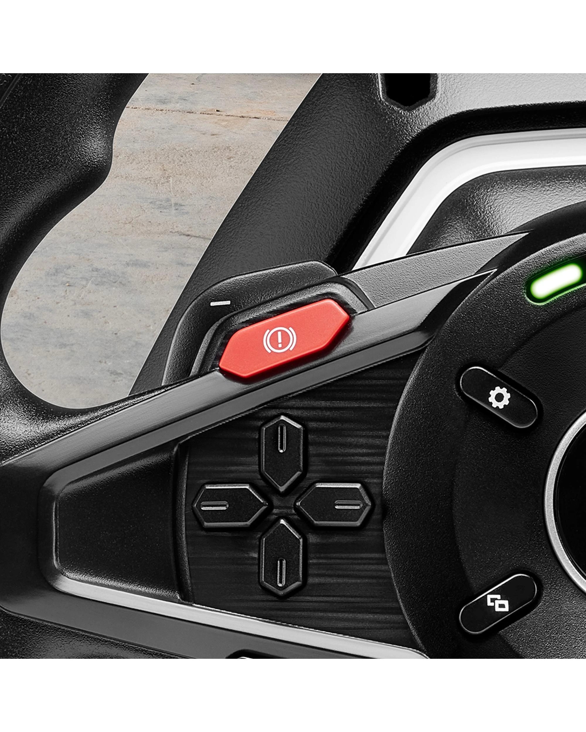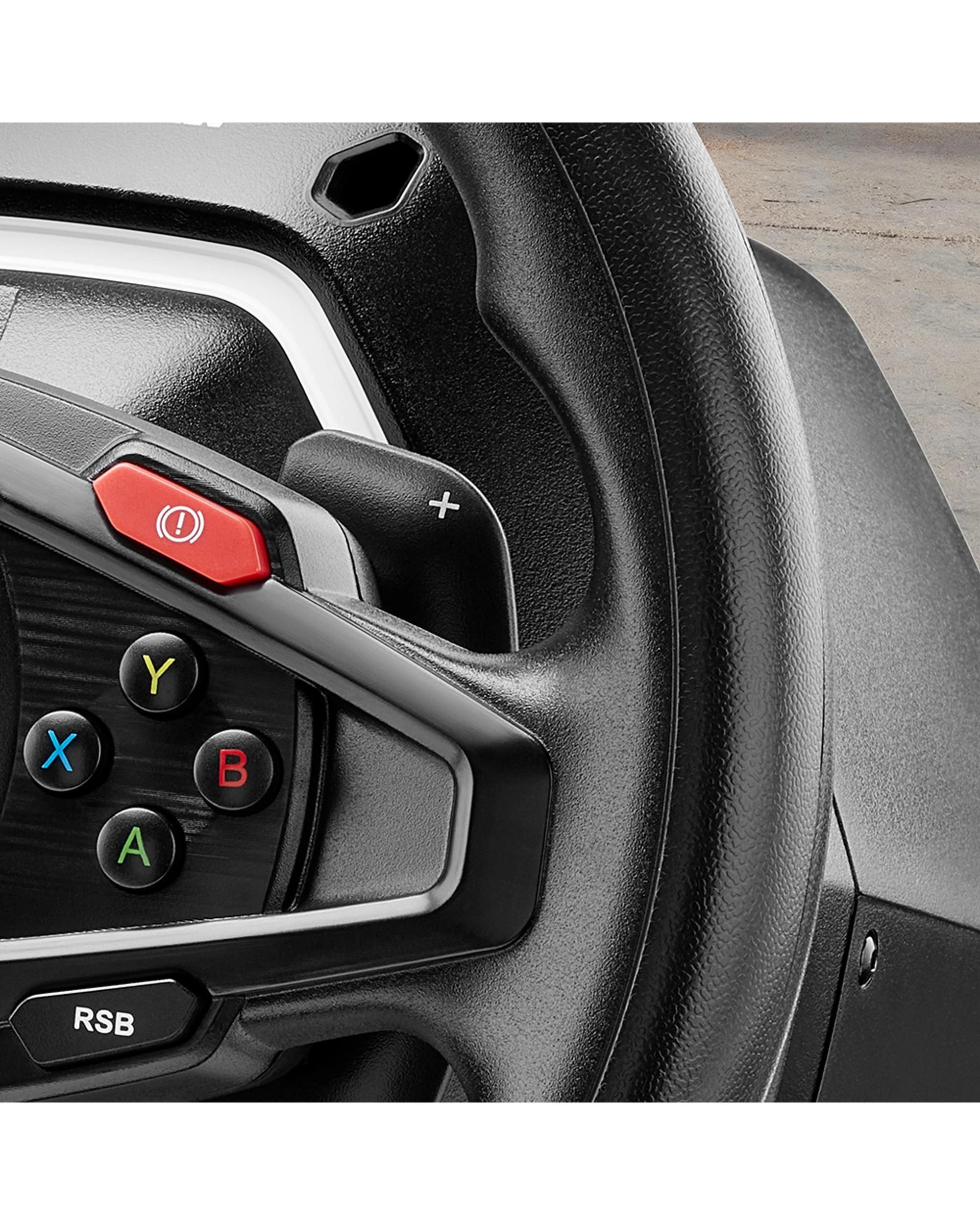 The front of the racing wheel includes two handbrake buttons that can be easily accessed with your thumbs for crazy drifts and freestyle manoeuvers. The button layout is symmetrical for ambidextrous use and more control, whatever the direction of your manoeuver.