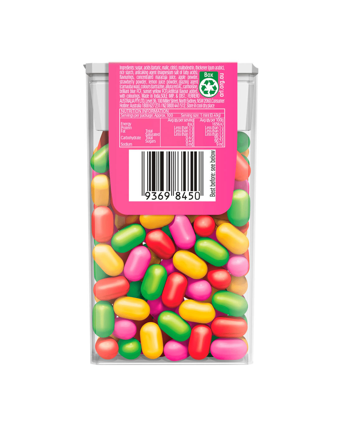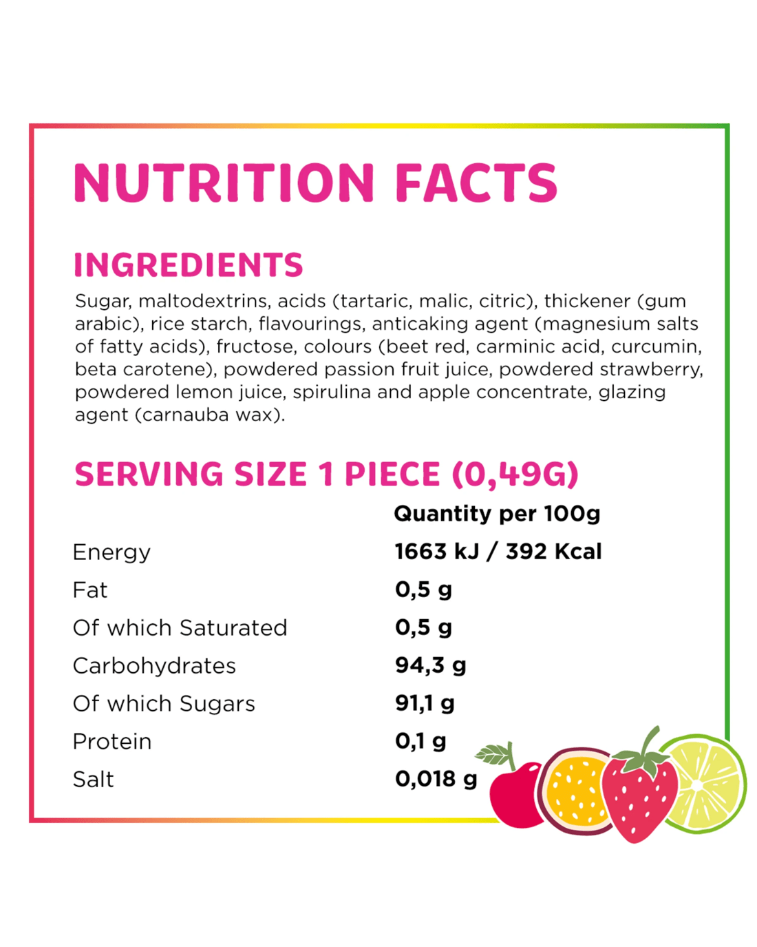 • Ingredients: Sugar, Acids (Tartaric, Malic, Citric), Maltodextrin, Thickener (Gum Arabic), Rice Starch, Flavourings, Anticaking Agent (Magnesium Salt of Fatty Acids), Fructose, Acerola Powder, Colours (Curcumin, Tartrazine, Allura Red AC, Brilliant Blue FCF, Carmine), Passionfruit Powder, Strawberry Powder, Green Apple Powder, Glazing Agent (Carnauba Wax), Lemon Juice Powder