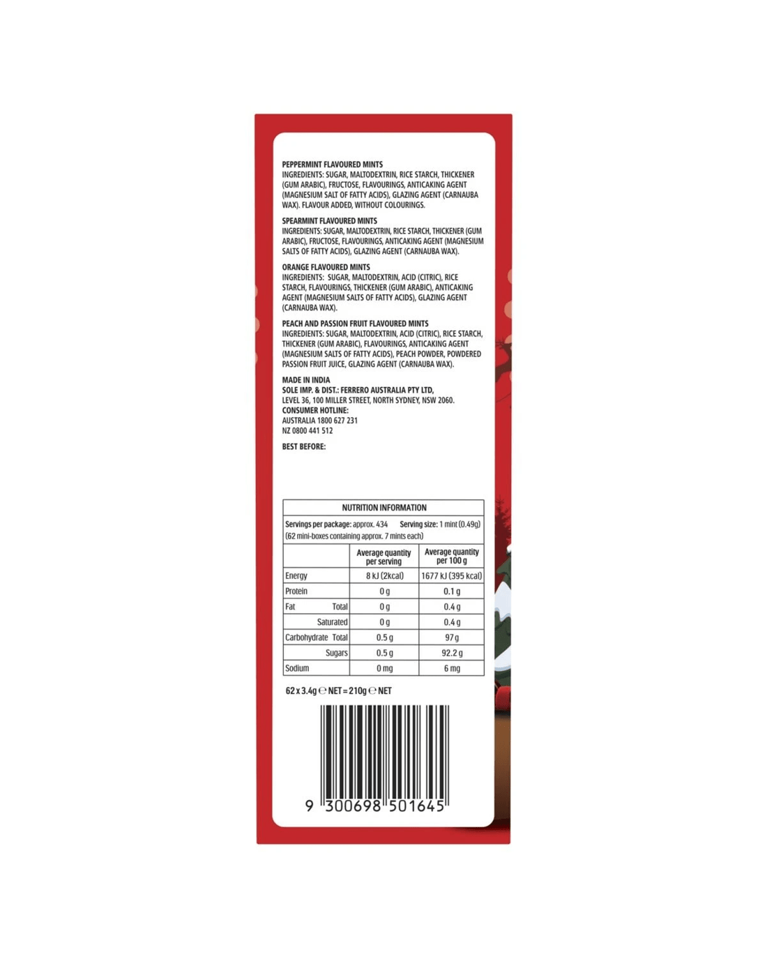 • Peach and passion fruit flavoured mints:: Sugar, Rice Starch. Maltodextrin. Acids (Citric. Tartaric), Thickener (Gum Arabic), Flavourings, Anticaking Agent (Magnesium Salts Of Fatty Acids), Powdered Passion Fruit Juice, Peach Puree Powder, Glazing Agent (Carnauba Wax)