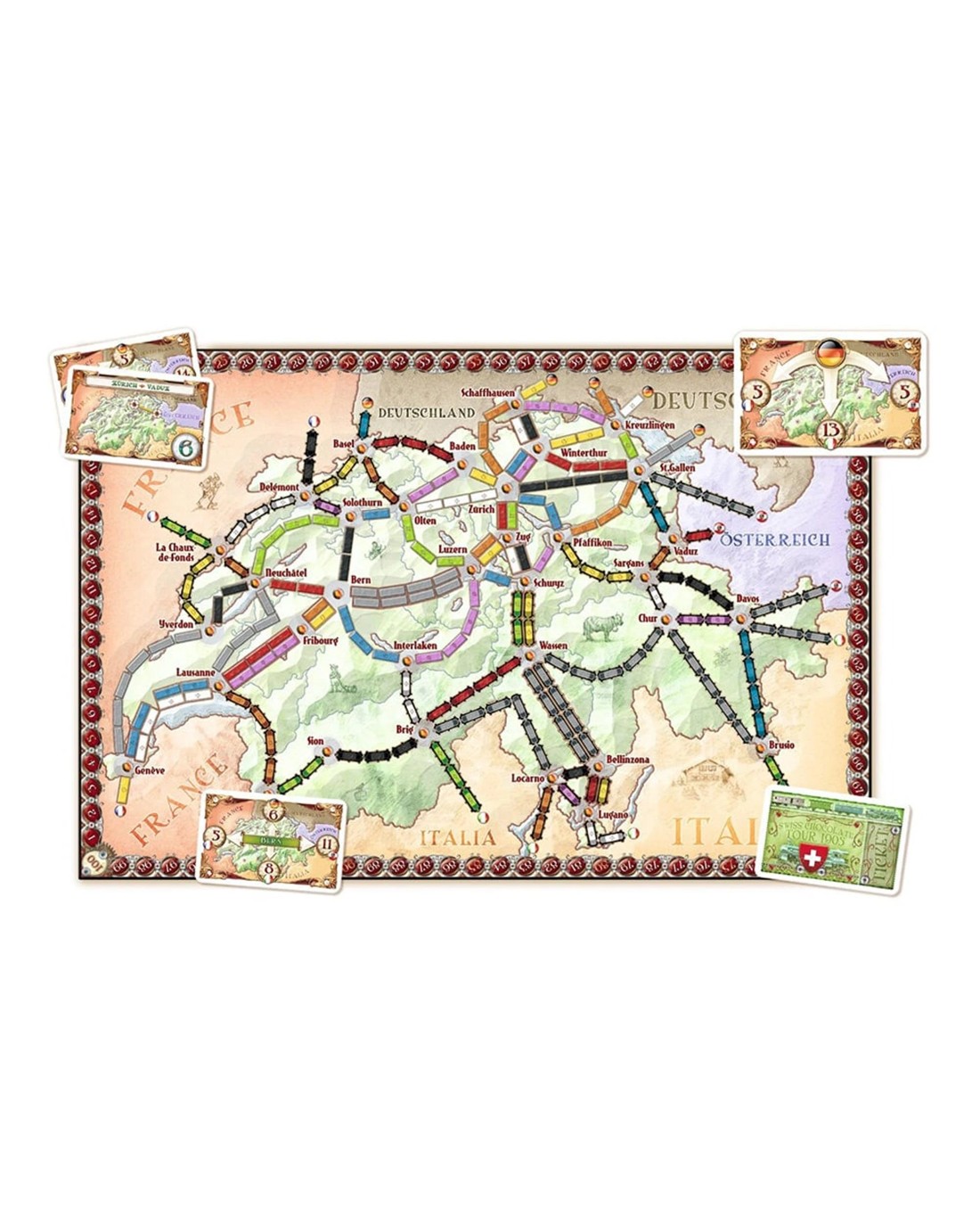 Embark on a tour of Ian Vincent's India and discover one of the most densely populated and colorful countries of the world. The year is 1911, and the world is changing fast in the British Raj. Will you complete your Grand Tour in time, or lose to more cunning - or simply better connected - opponents? Also includes Alan R. Moon's terrific map of Switzerland, specifically designed for 2 and 3 players and made famous by Ticket to Ride Online! Discover Switzerland's challenging geography with its verdant valleys and mountain passes, as well as the charm of its neighboring countries. Ages: 8 + | Players: 2 - 4