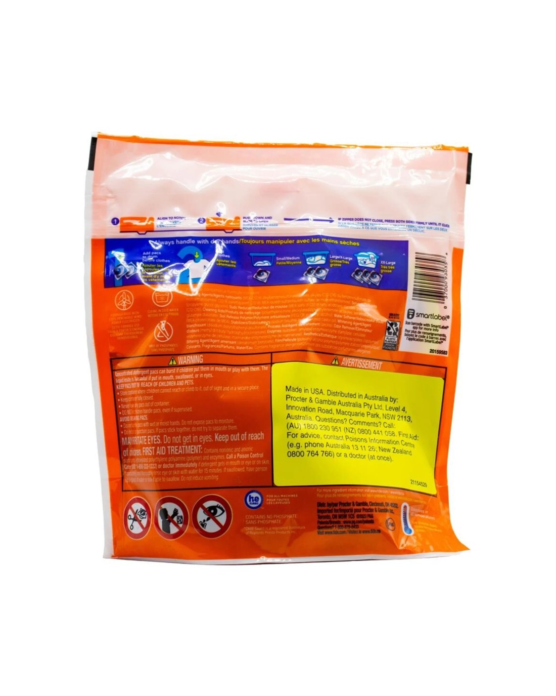 Ingredients: Cleaning agents, solvents, suds reducer, cleaning aids, soil release polymer, water softener, stabilizers, whitening agent, process aid, enzymes, aesthetics, bittering agent, film, water
