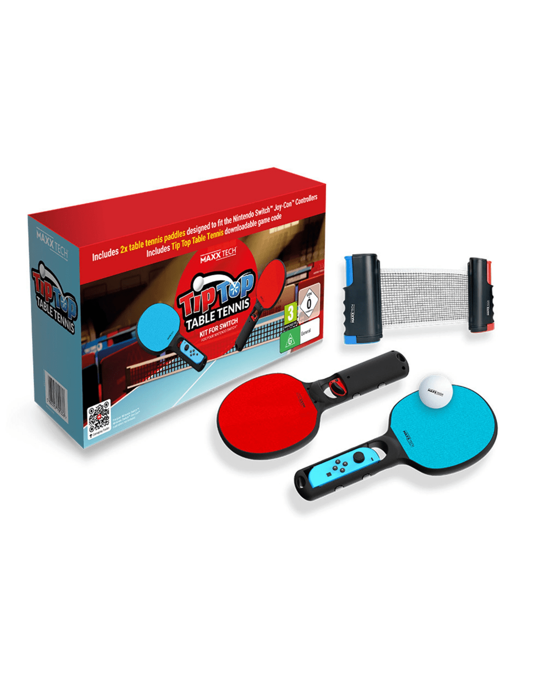 Includes 2x table tennis paddles, an adjustable net, a ping-pong ball and a digital game code for the Tip Top Table Tennis game