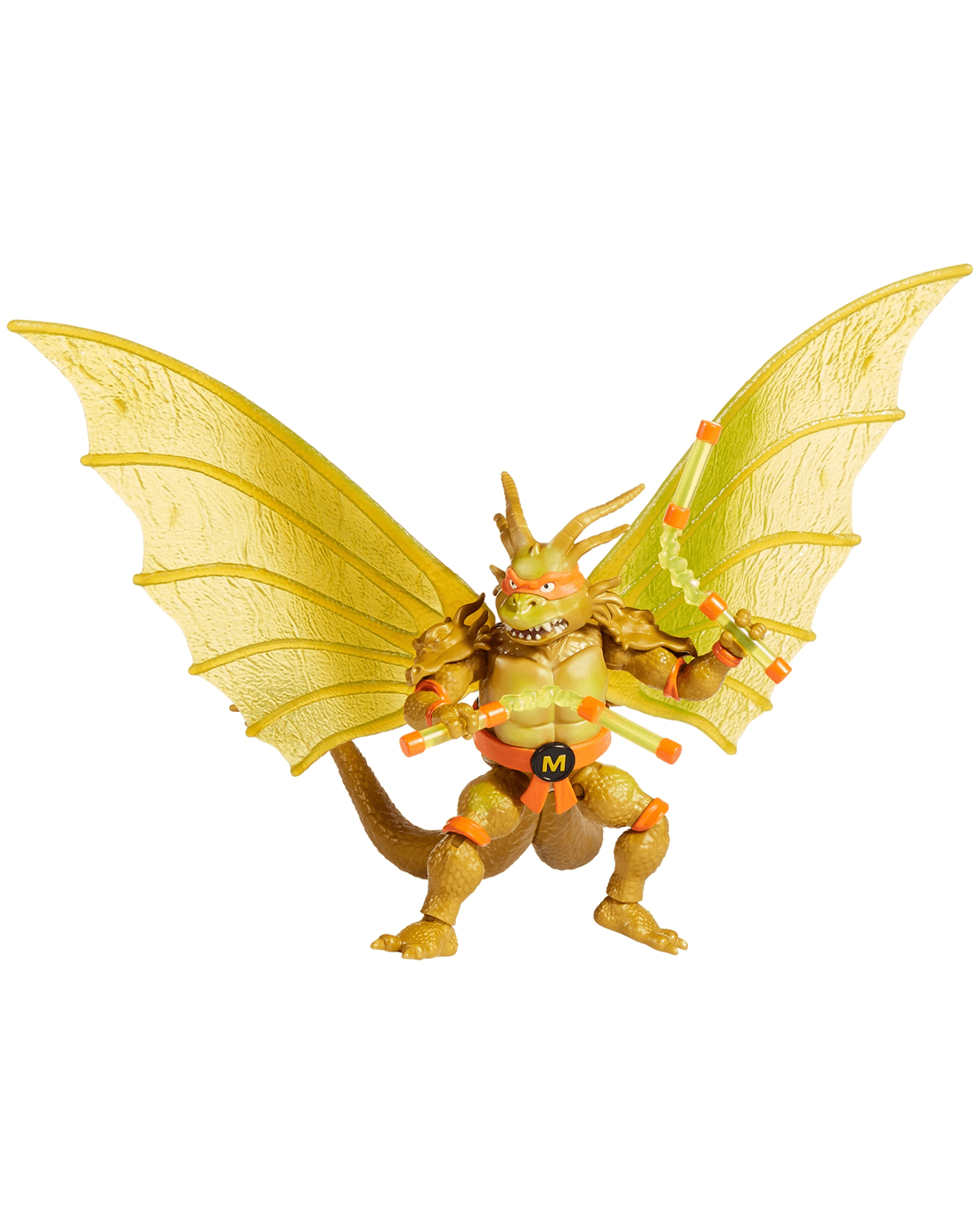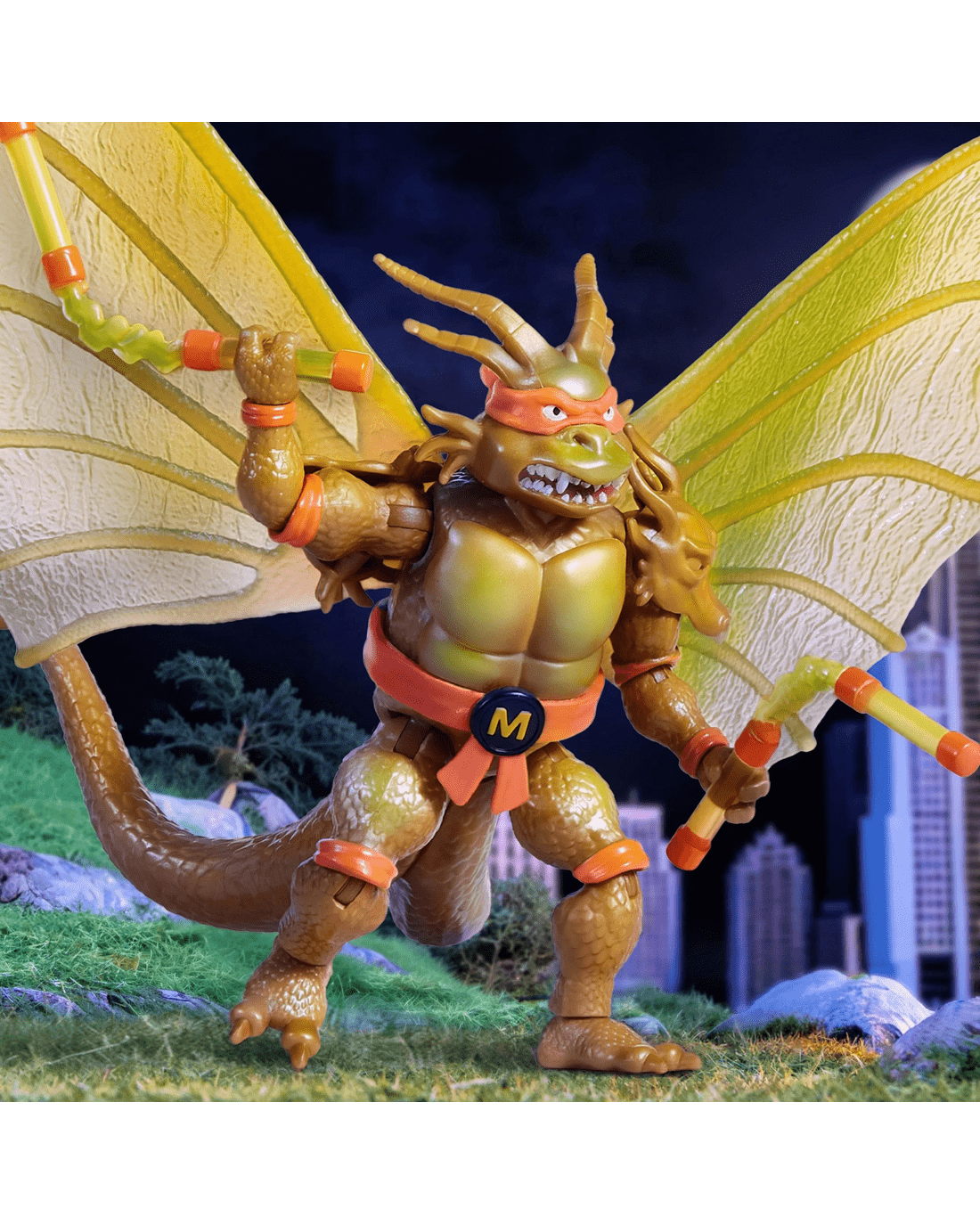 - The figure comes equipped with Michelangelo's iconic nunchaku, infused with King Ghidorah's electric gravity beam.