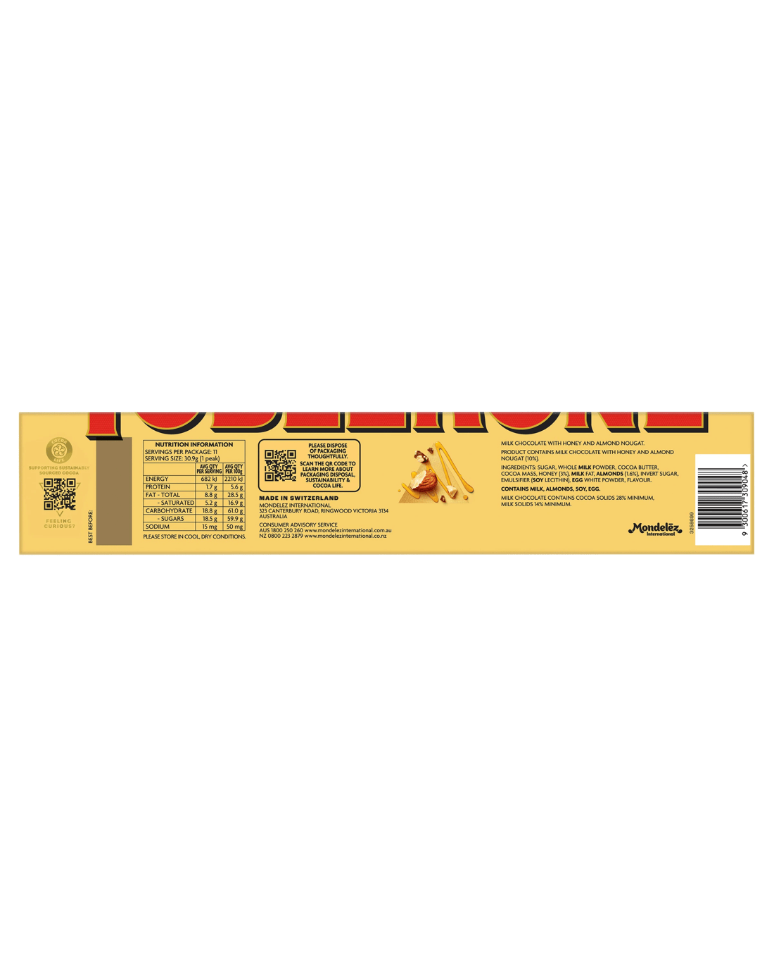 - Contains milk chocolate with honey and almond nougat (10%)