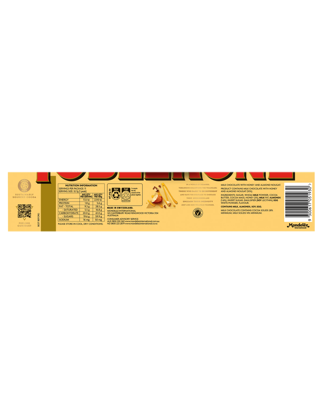 - Contains Swiss milk chocolate with honey and almond nougat (10%)