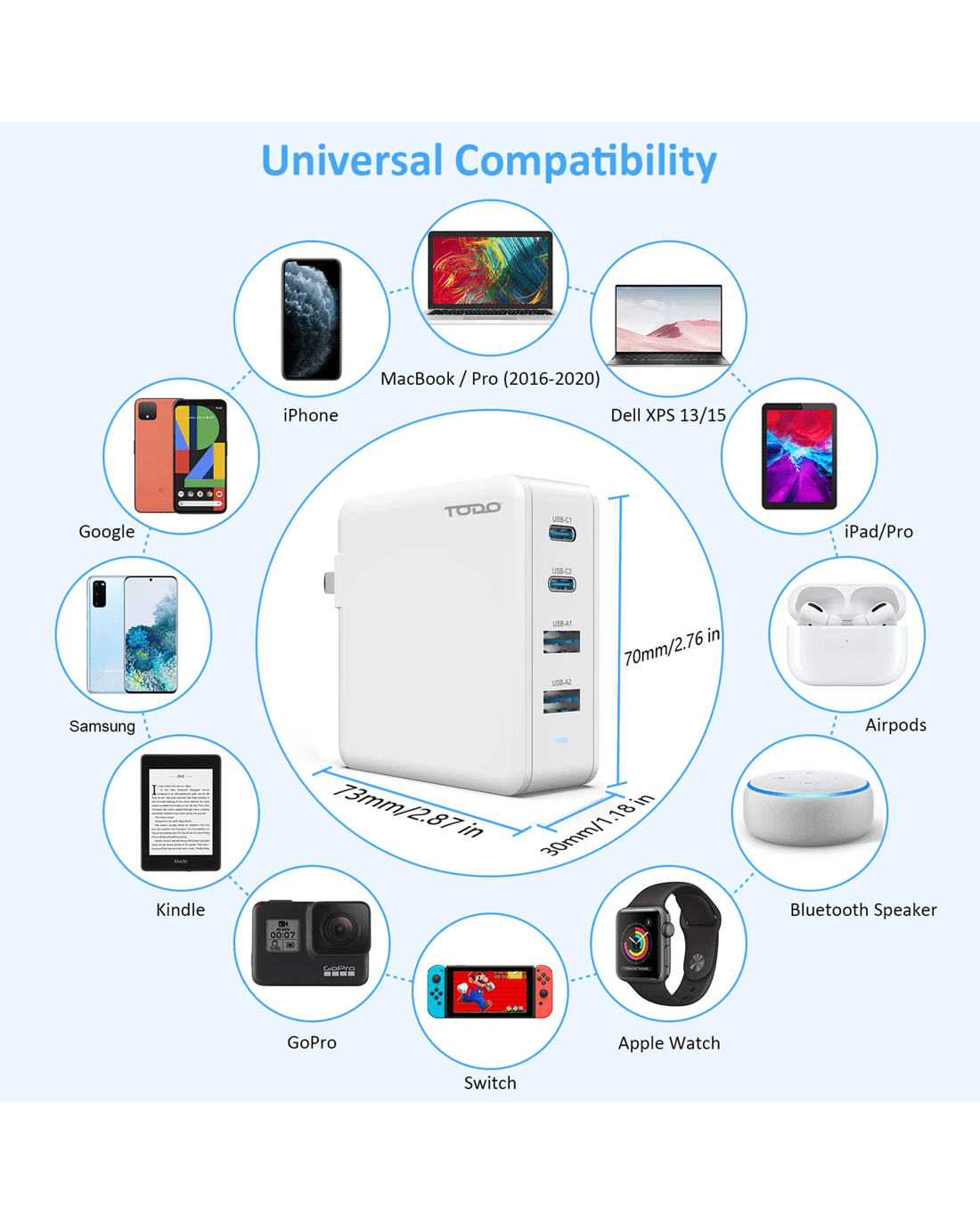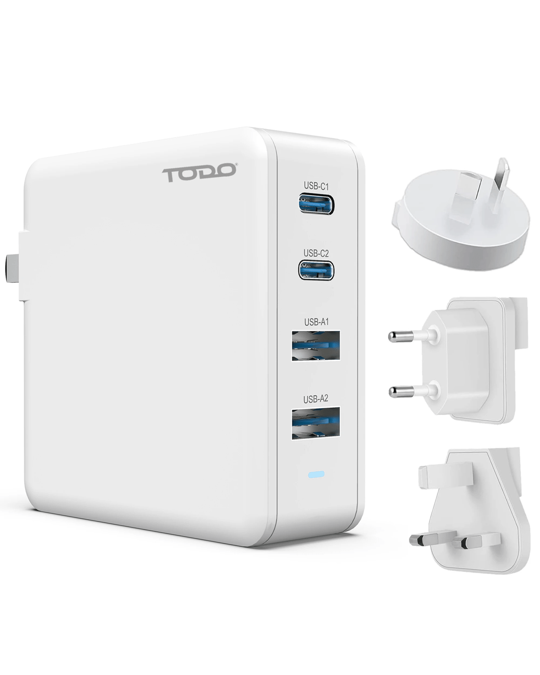 Travel the world with TODO 100W GaN Fast Travel Charger all in one compact companion to power you up! With 2 USB Type-C and 2 USB Type-A sockets this universal travel charger ideal to charge your laptop, phone, ipad, tablets and cameras all at once. Most importantly your safety is ensured as the device conforms and complies with various international certification bodies. Powerful GaN Technology supports fast charging on a wide variety of devices from Laptops, Phones and accessories.