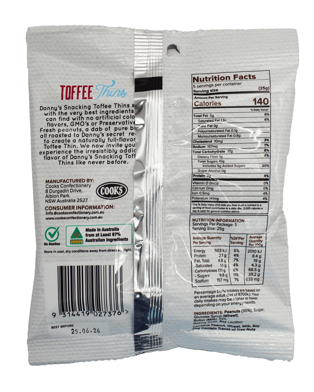 • Ingredients: Peanuts (30%), Sugar, Glucose Syrup (Wheat), Butter (Milk), Salt, Baking Soda, Soy Lecithin