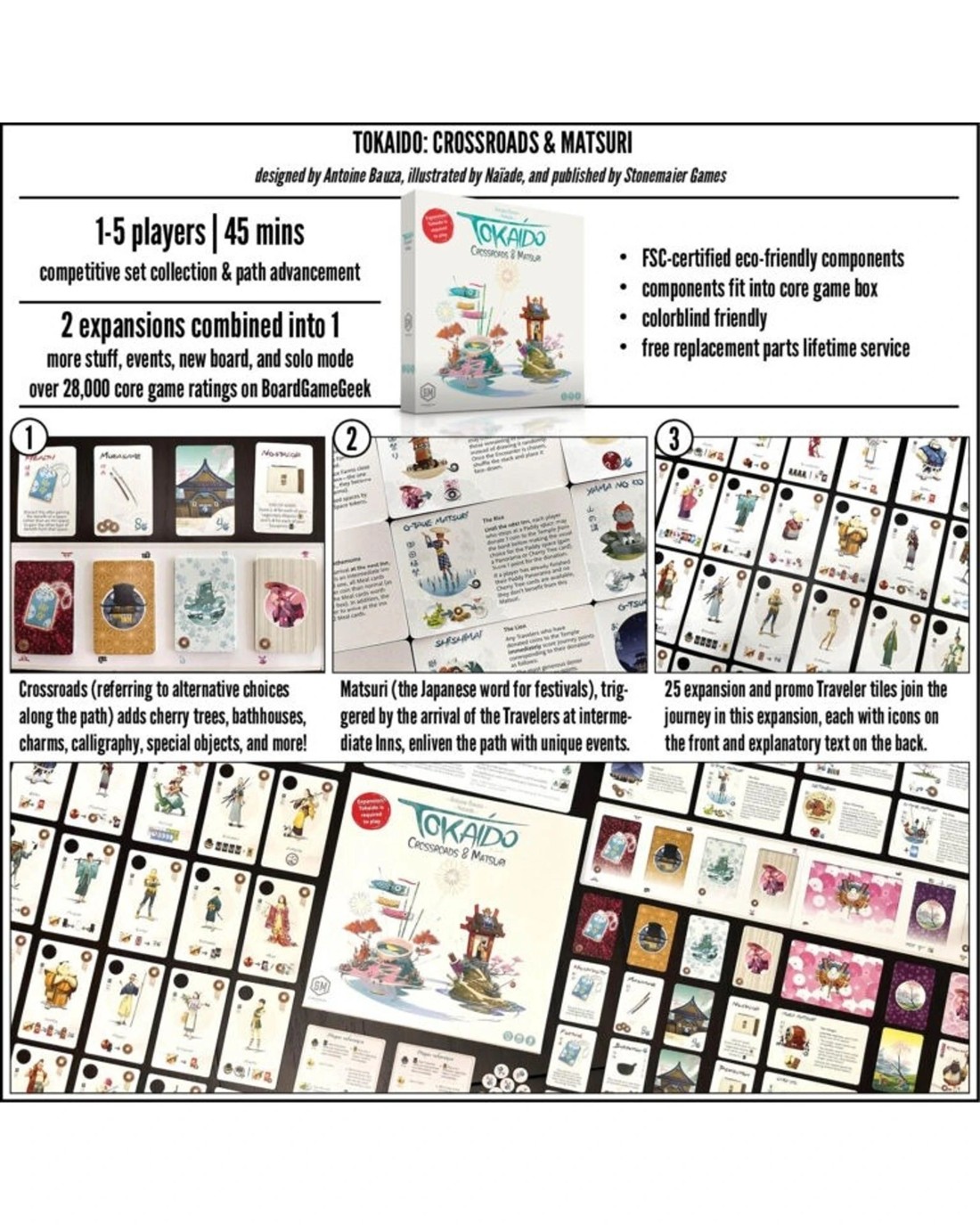 Tokaido: Crossroads & Matsuri combines the original two expansions and most promos into one box, adding a level of complexity to the core game. All components fit into the core Tokaido box. Crossroads adds cherry trees in full bloom, luxurious bathhouses, good luck charms, calligraphy, legendary objects, and even clandestine gambling rooms to the Tokaido journey! Matsuri, triggered by the arrival of the Travelers at intermediate Inns, enliven the path with unique events. A number of new Travelers are now also available for the trip. Ages: 8 + | Players: 1 - 5 | Playtime: 45 min