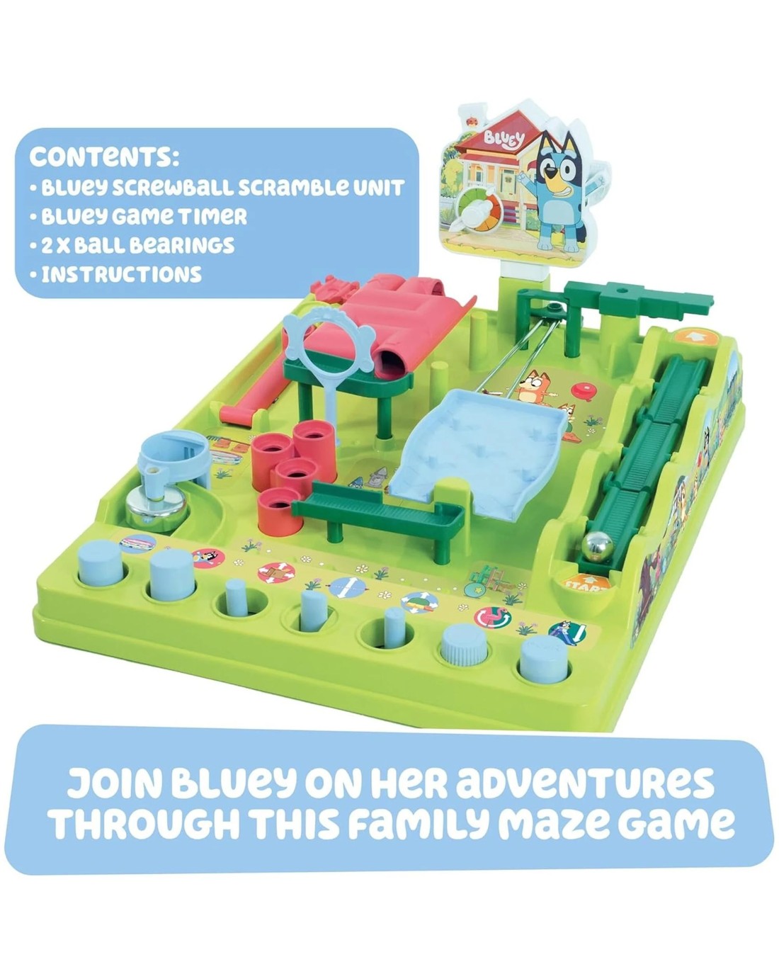 Bluey's Big Challenge: Just like in the show, teamwork and determination are the name of the game—Guide your marble through a wild obstacle course in this exciting Bluey game that's full of surprisesHelp Bluey Beat the Maze: Tilt, turn, twist, and bounce your way through the course—catch the marble with the magnetic crane, find your way through the tunnels, and race to the finish!Race Against the Clock: Whether guiding Bluey on your own or going head-to-head with friends, this game brings the excitement with fast-paced fun for 1-4 playersWackadoo-Worthy Family Fun: A perfect pick for family game night or playdates, this Bluey toy is made for kids ages 5 and up—and it's just as fun to watch as it is to play!Award Winning Kids Games: Screwball Scramble is fun for the whole family and is one of the hottest toys of the season! This Bluey game is one of Toy Insider's Top Holiday toys for 2025Item Specifics