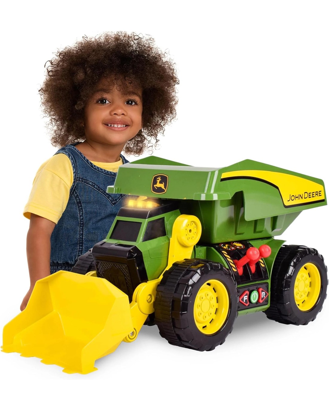 The John Deere 2-N-1 Dig Rig - Dump Truck and Front-End Loader with Lights, Sounds and Motorised Drive. Dig, Dump and Drive with the ultimate Action vehicle. Young workers can pretend to take the driver's seat with the 2-N-1 Dig Rig. Realistic lights and sounds will help create the environment of a real work site. Hear the roar of the automotive sounds while you drive forward and reverse across the roughest terrain. When kids want to play in the dirt or sand pit, the Dig Rig is the perfect choice for sensory play. Featuring real scooping and digging action, this vehicle has everything to really get the job done. Use the levers to dig up dirt, toys and more! Lift over 3.5Kg (8 pounds) of materials into the bed of the rig and dump it out. Measuring over 45cm (18 inches) long, this vehicle can take on the toughest tasks. Encourage independent playtime with this two-in-one toy that will let kids live out their big imaginations! Maxximum power, maxximum action, maxximum fun! Ages: 3+