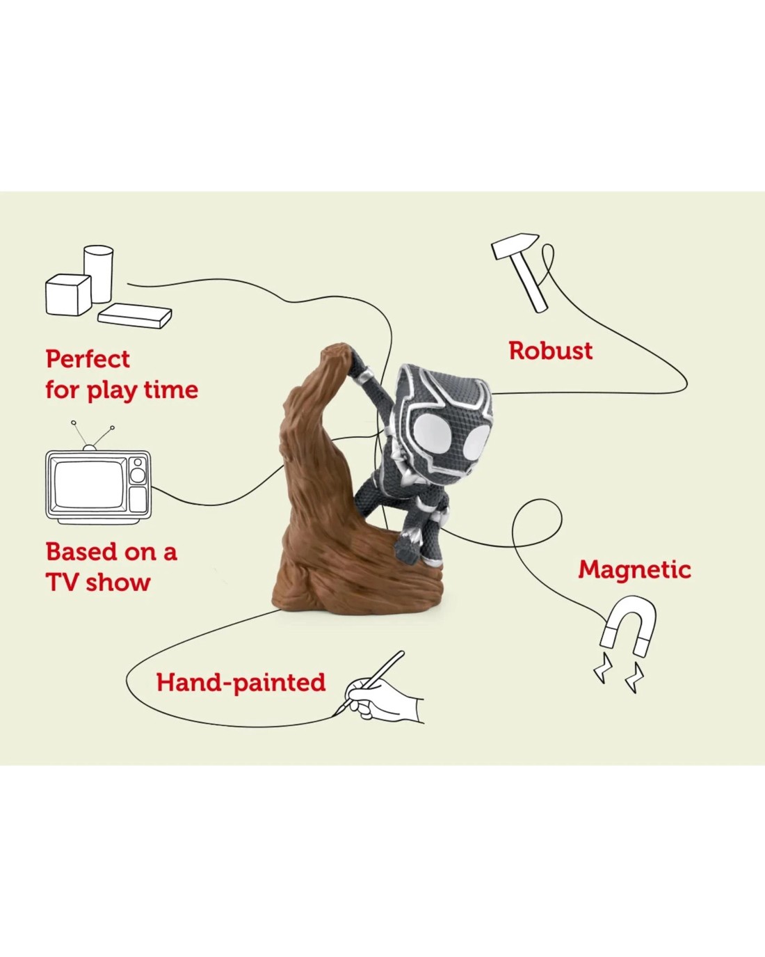 Let your child's imagination swing into action with the Black Panther Tonie Audio Character. Simply pop Black Panther on top of your Toniebox and watch as young superheroes are whisked away to a world of adventure with Spidey and his Amazing Friends. Whether your little one is gearing up for a day of heroic play or settling down after a whirlwind afternoon, this Tonie is a fantastic way to keep them entertained. With super stories and catchy tunes, it encourages teamwork, perseverance, and creativity. Make every journey or bedtime more exciting and bring a touch of Wakandan magic and Spidey fun to your home with this energetic audio companion.