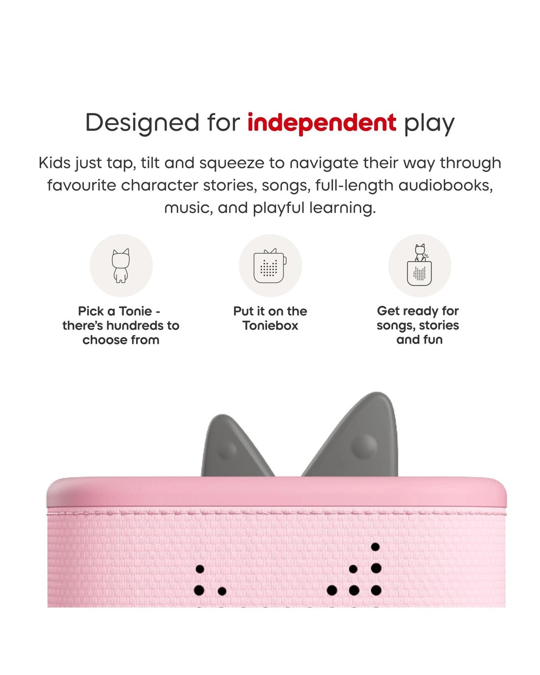 - KID-FRIENDLY DESIGN: Intuitive controls mean kids can tap, tilt or squeeze to navigate their way through their favourite songs, stories, games and more. No screens or menus in sight.