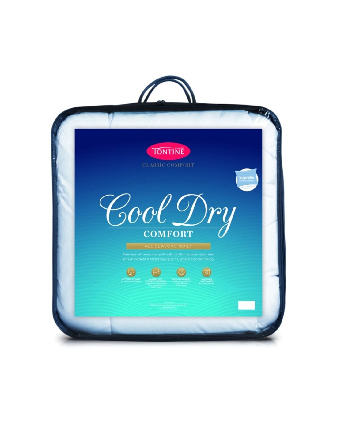 The Tontine Classic Comfort Doona Cool Dry All Seasons Quilt is designed for those seeking a versatile and comfortable sleeping solution. Crafted with innovative Suprelle42 Climate Control fibres, this quilt effectively wicks moisture away from your body, helping you stay cool and dry throughout the night. The breathable premium cotton japara cover enhances airflow, promoting a fresh and comfortable sleep environment for all seasons.