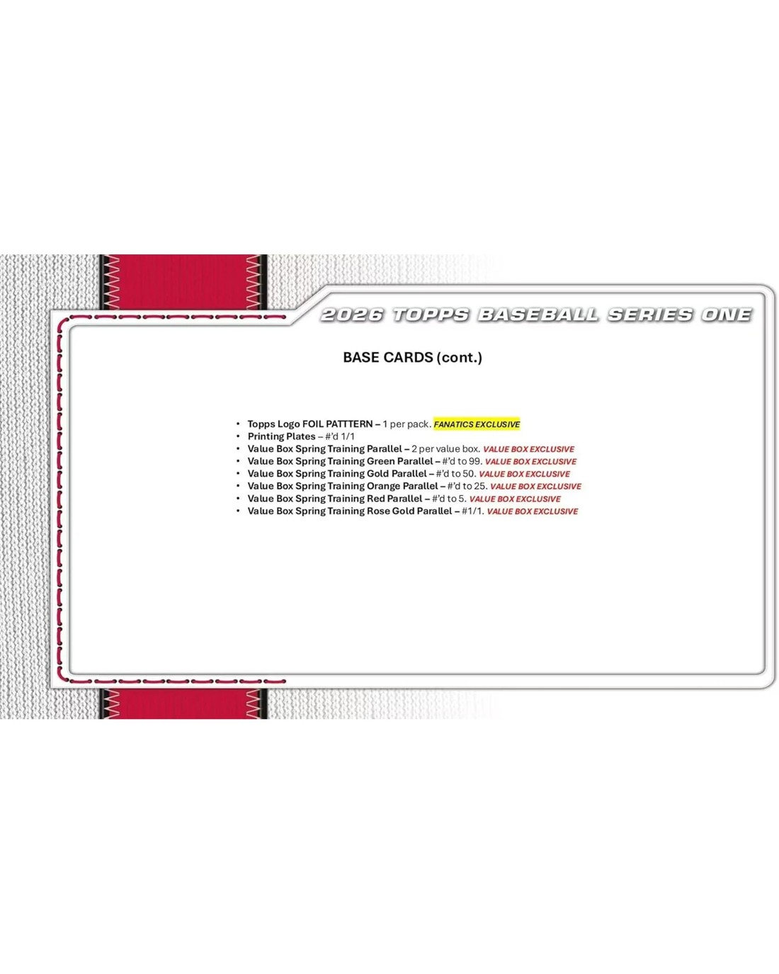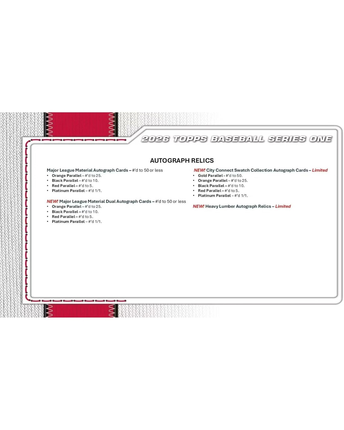 Celebrate the 75th anniversary of Topps Baseball with 2026 Series 1. Collectors will find the league's current stars, greats from the past, and rising rookies featured on base cards, inserts, and autograph and relic cards.
