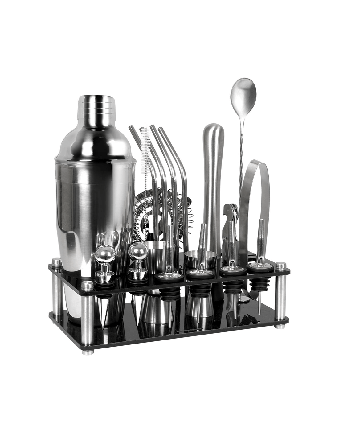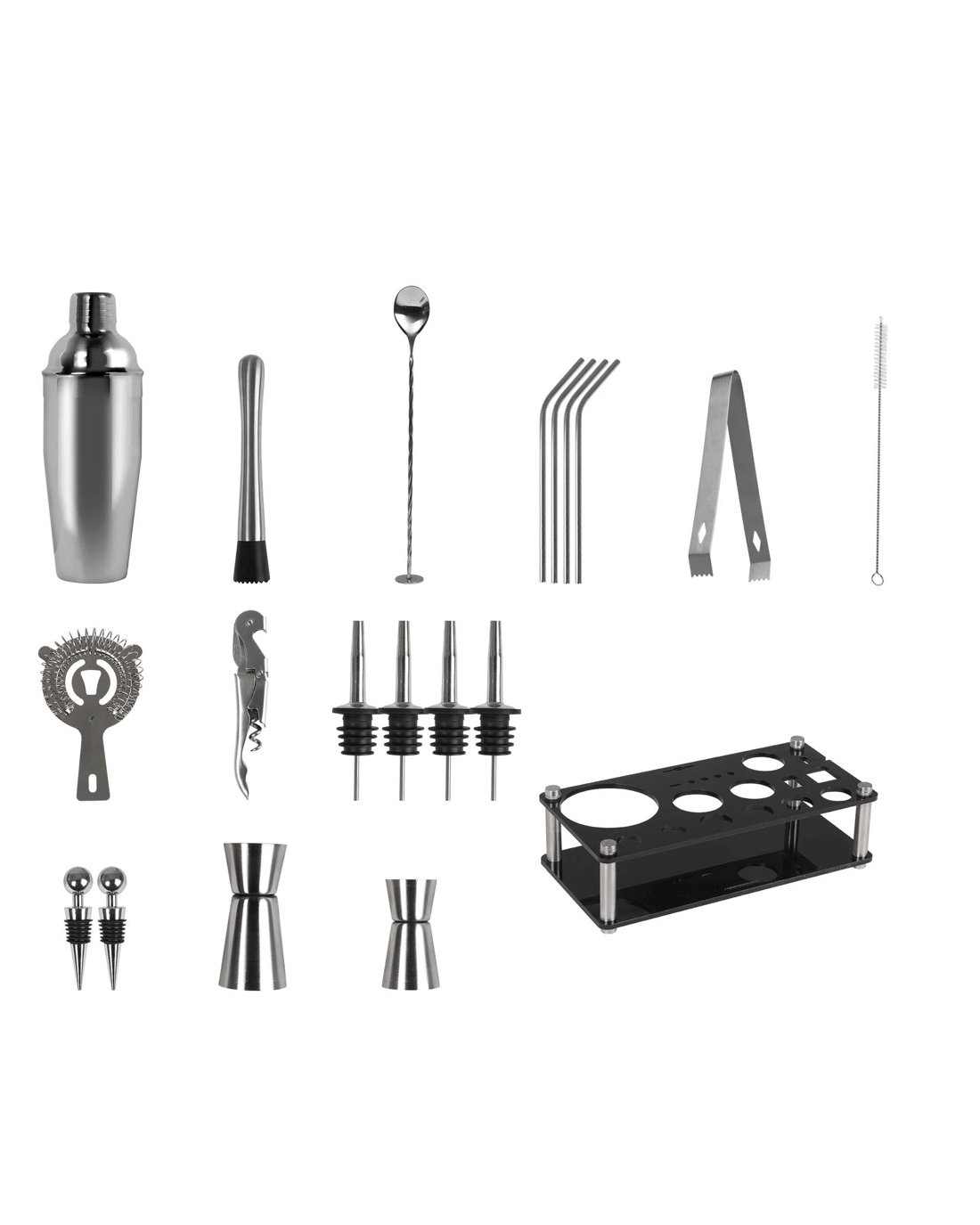 Open up your wine bottle with the corkscrew. Stop it up with the rubber-seal bottle stopper. Use the ice tongs for their super obvious purpose. Hook up your alcohol bottles with speed pourers. All you need and more.