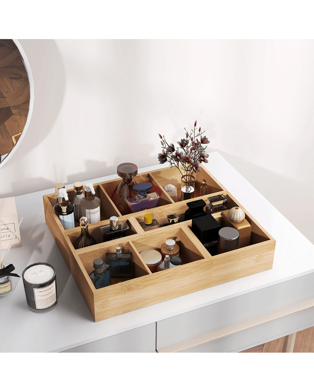Designed with removable dividers, these bamboo drawer storage bins allow flexible layouts to suit different needs. The set also comes with pre-assembled labels for quick and easy organization. Whether used as a bamboo organiser box in the kitchen, bathroom, or office, this bamboo storage organiser set offers practical storage with an elegant look.