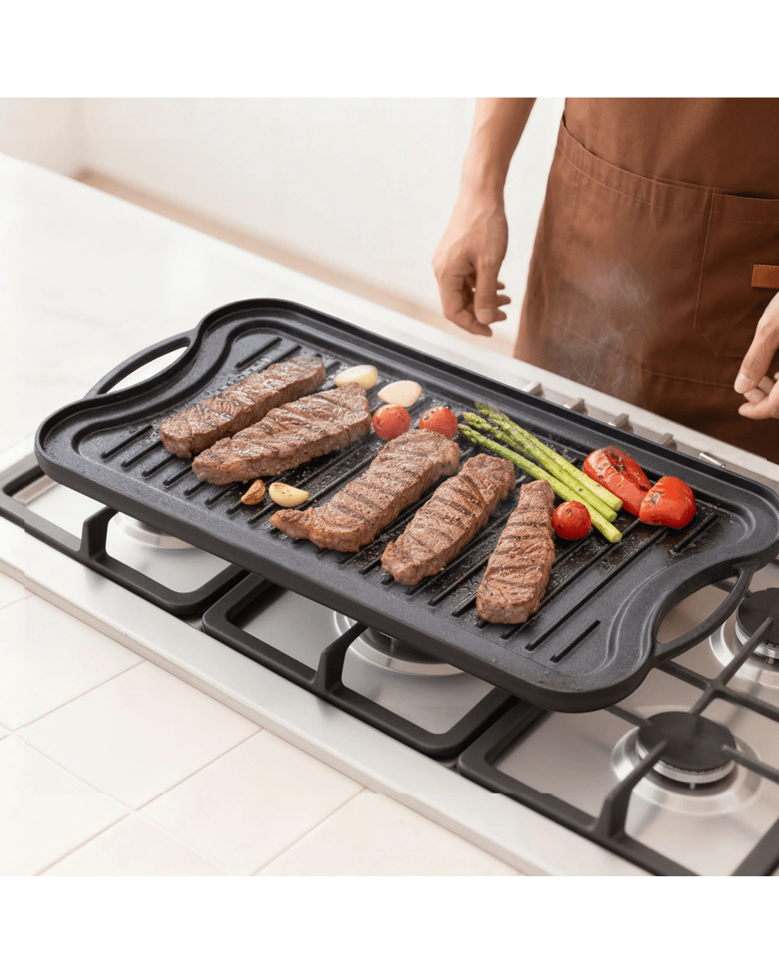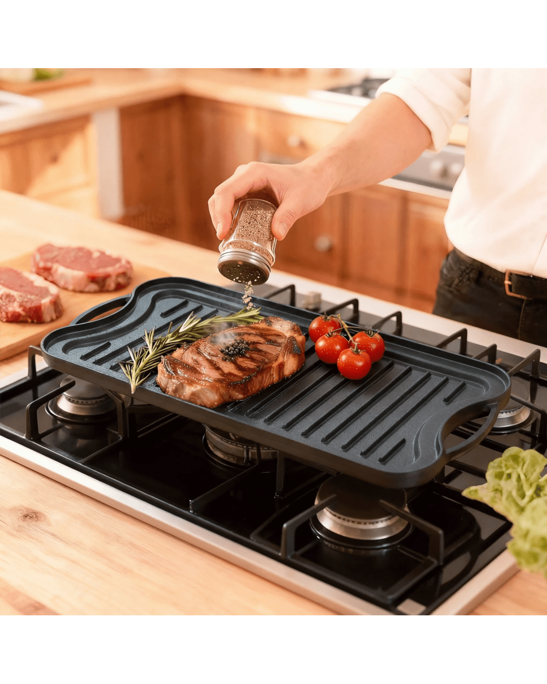 Experience versatile cooking with the Toque cast iron frying pan, crafted from heavy-duty cast iron and pre-seasoned with 100% plant oil for a natural non-stick surface. This reversible cast iron griddle features a smooth side for eggs and pancakes and a grooved side for grilling meats and vegetables, making it a perfect cast iron skillet, grill pan, or large cast iron pan.