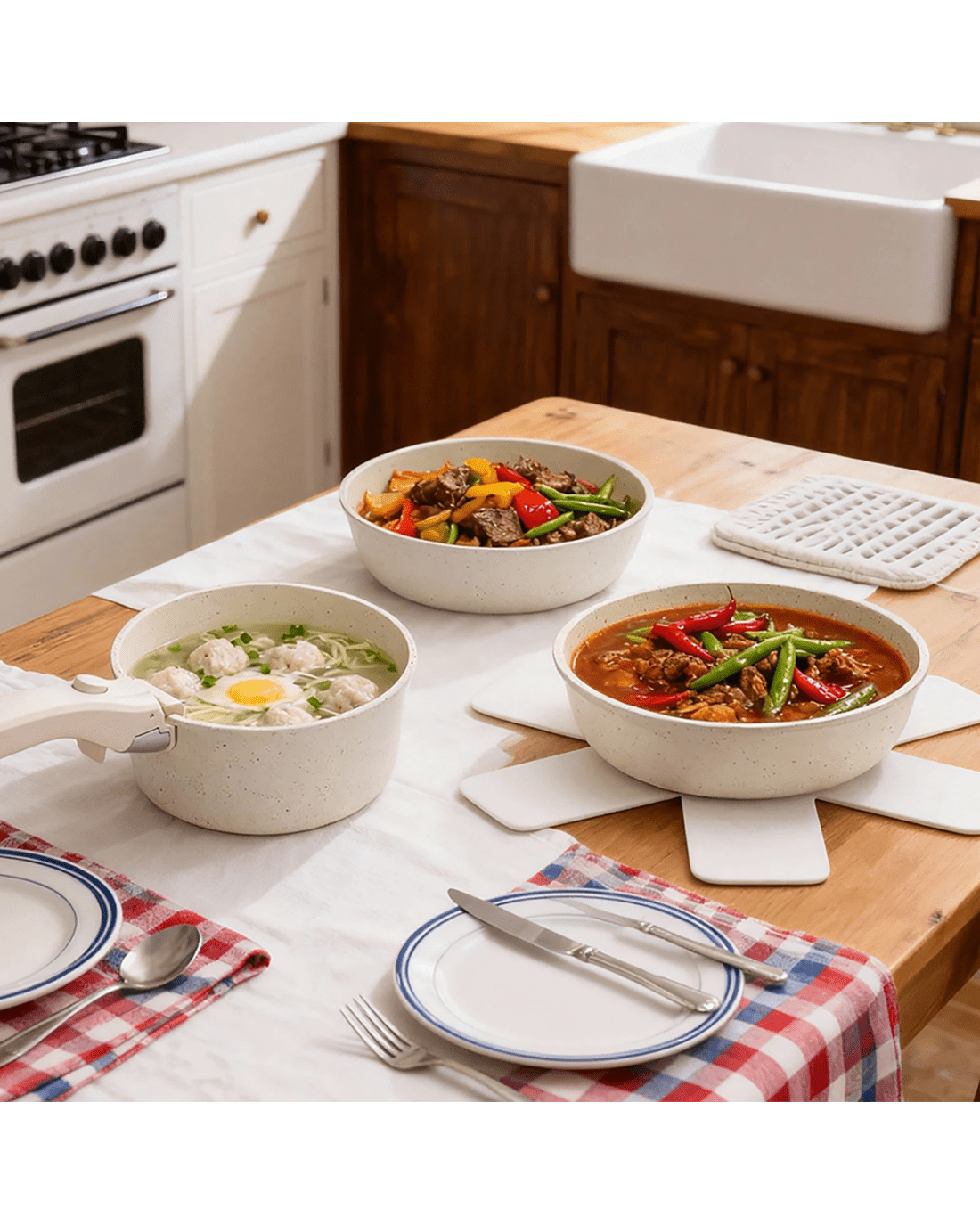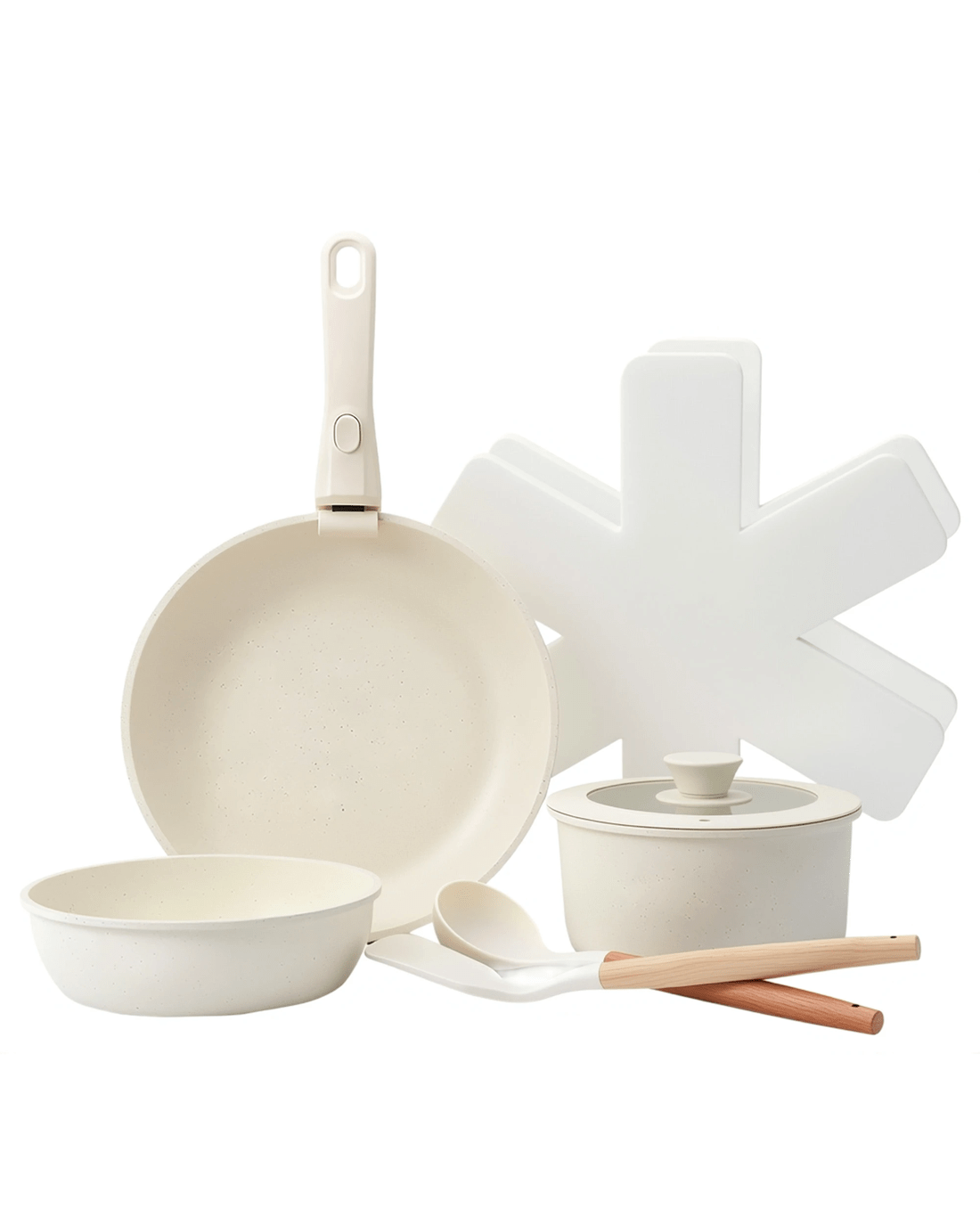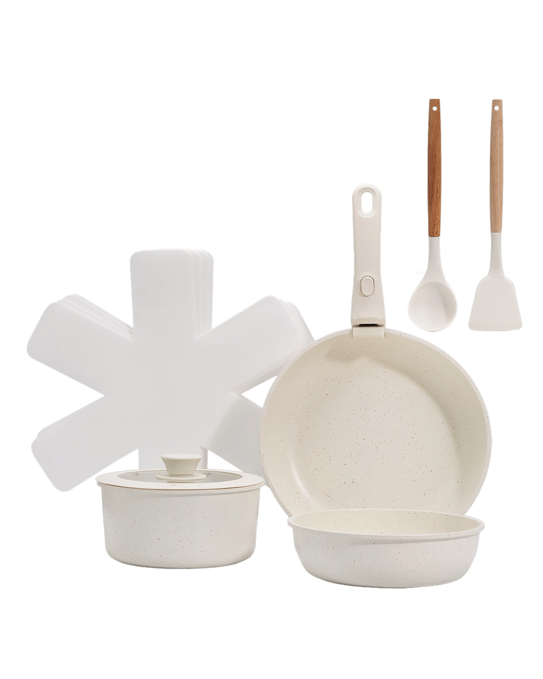 This white cookware set includes three pots of different sizes, a frying pan, silicone spatula, spoon, and heat-insulation pads—creating a complete cooking pot set, fry pan set, and kitchen cookware set all in one. The Toque pots and pans set combines style, functionality, and durability, perfect for everyday meals or special occasions.