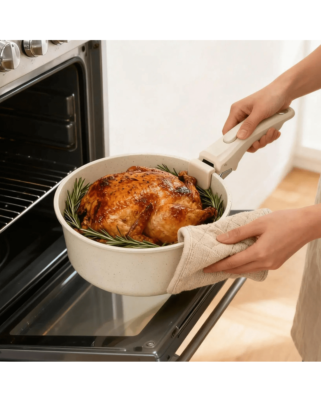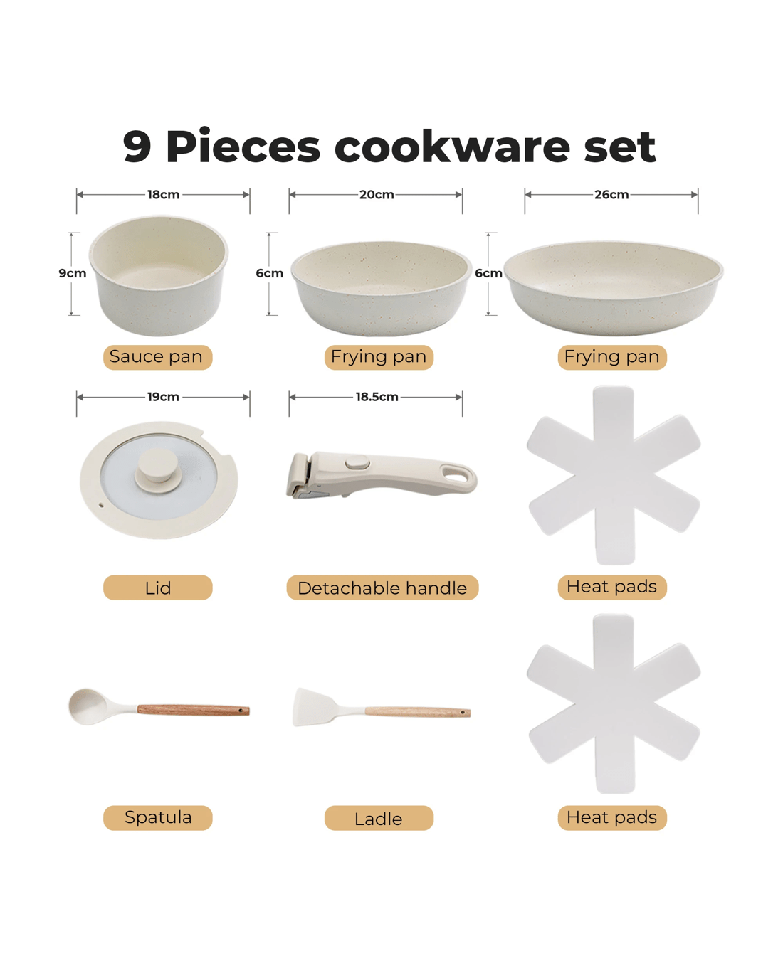 Upgrade your cooking experience with the Toque 9-Piece Cookware Set, designed for versatility and convenience in any kitchen. This non stick cookware set features durable marble cookware coating on premium aluminium alloy, ensuring even heat distribution and effortless food release. Perfect for all your cooking needs, these stackable pots come with a detachable handle cookware design, saving space and making storage simple.