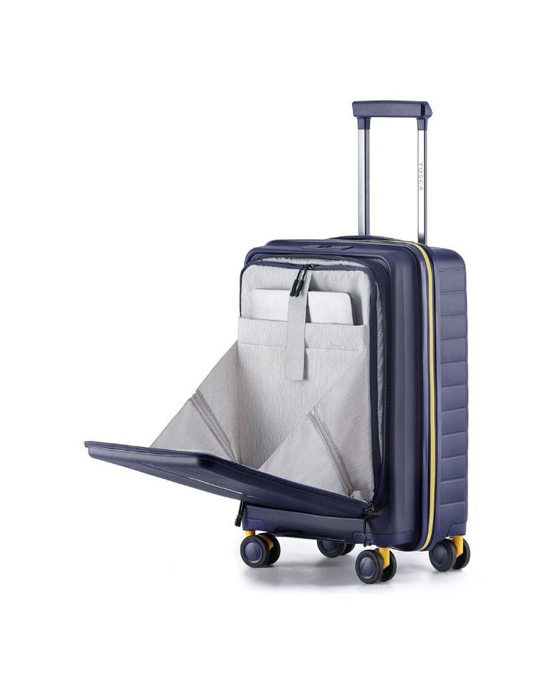 The TOSCA 3pc Cruiser Hard Case Travel Suitcase Luggage Set is designed for travellers seeking durable and stylish luggage solutions. This set includes three impact-resistant polypropylene suitcases in a sleek deep navy blue with vibrant yellow accents, offering versatile packing options for various trip lengths.