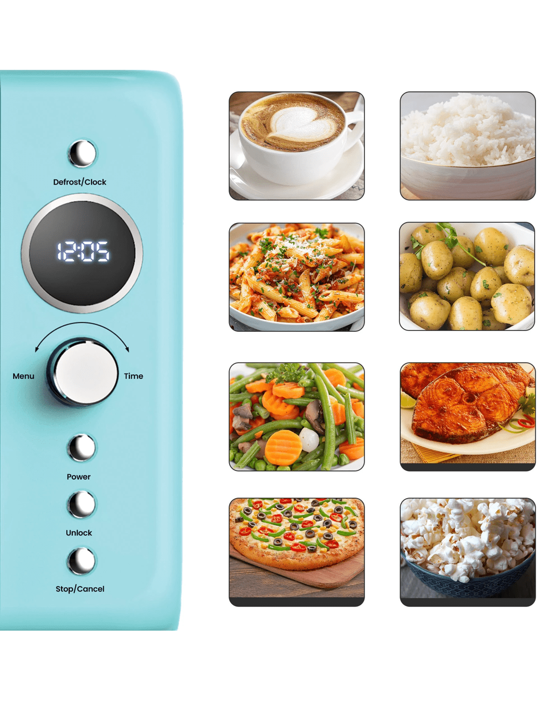 Retro-style microwave adds an eye-catching vintage vibe to your counter: This compact and powerful 0.7 cubic foot microwave with simple dial and push-button controls is ideal for apartment kitchens, office lunch rooms, cottages, or dorms. It features 700 Watts of cooking power with 6 power levels plus Quick Start and Defrost by weight or time options. The vibrant blue exterior and chrome accents easily wipe down and the removable glass turntable and roller ring are dishwasher-safe for hassle-free cleanup.