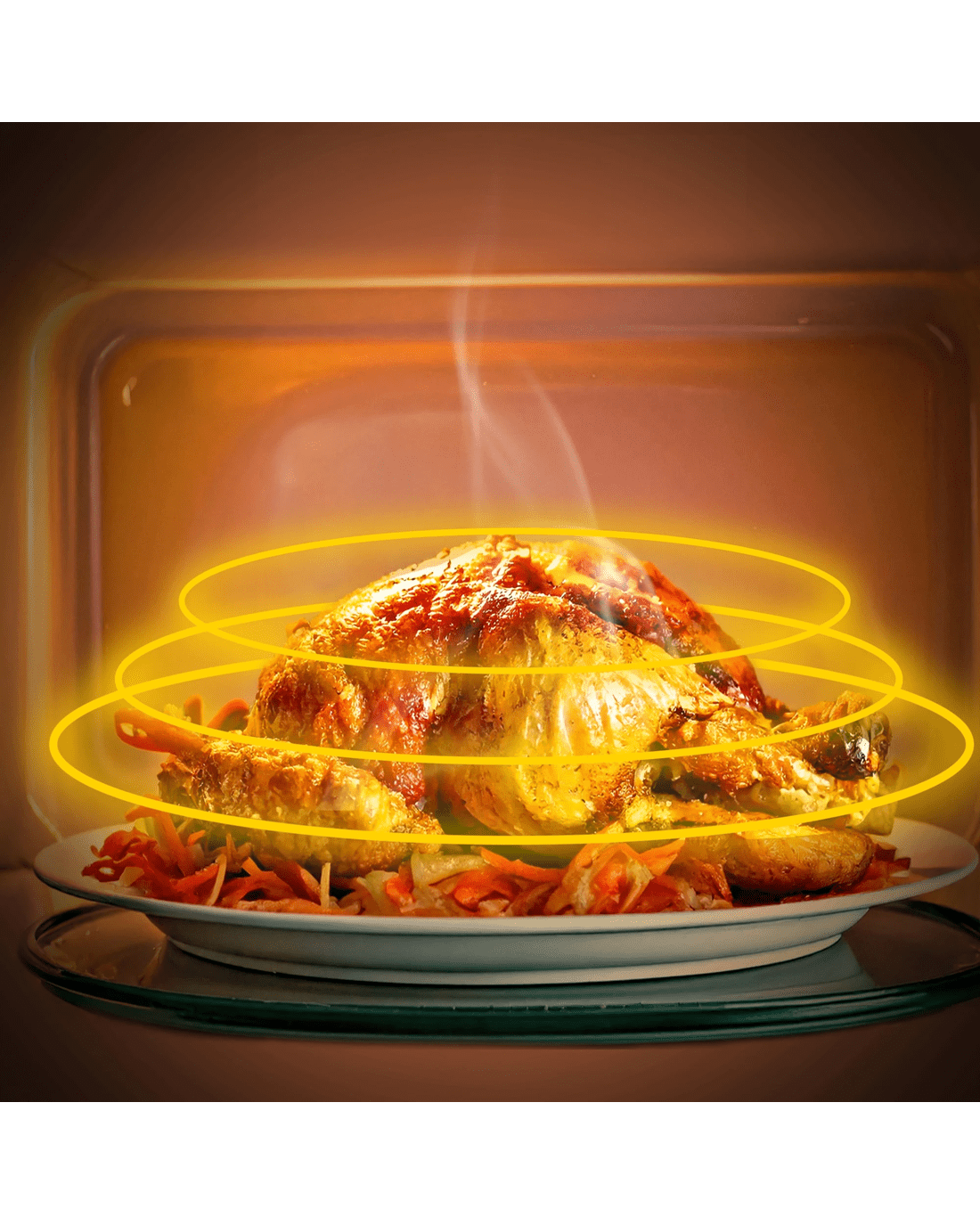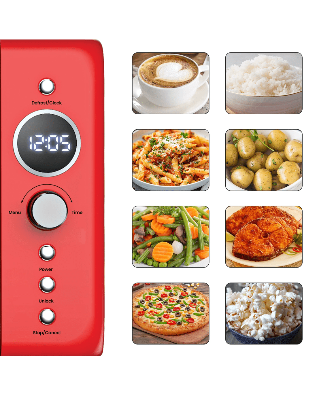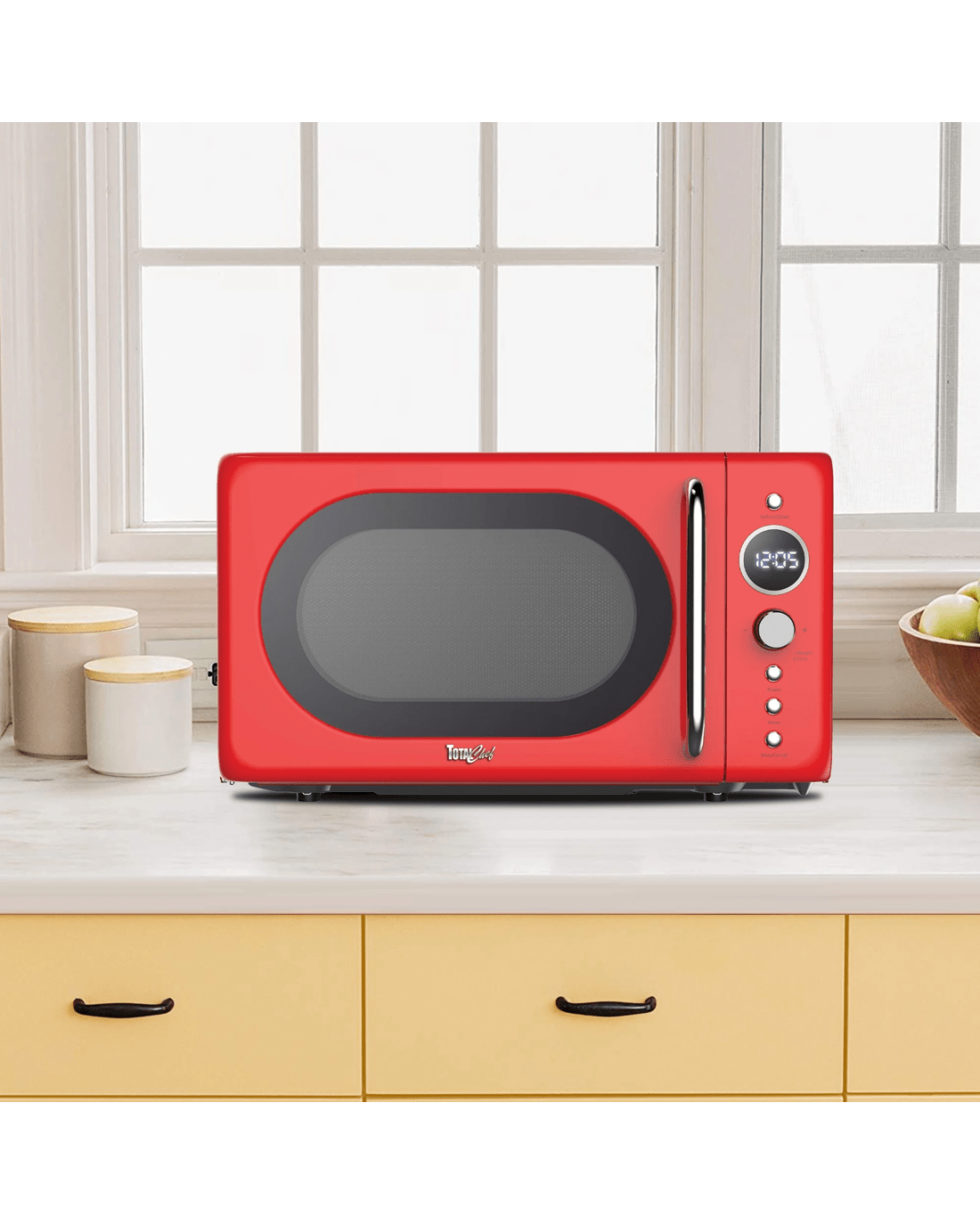 Retro-style microwave adds an eye-catching vintage vibe to your counter: This compact and powerful 0.7 cubic foot microwave with simple dial and push-button controls is ideal for apartment kitchens, office lunch rooms, cottages, or dorms. It features 700 Watts of cooking power with 6 power levels plus Quick Start and Defrost by weight or time options. The vibrant red exterior and chrome accents easily wipe down and the removable glass turntable and roller ring are dishwasher-safe for hassle-free cleanup.