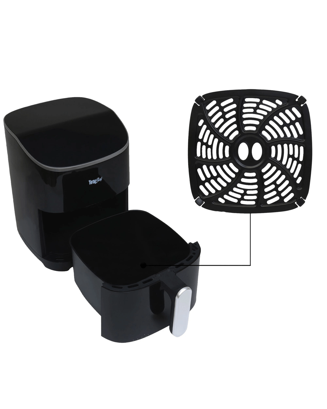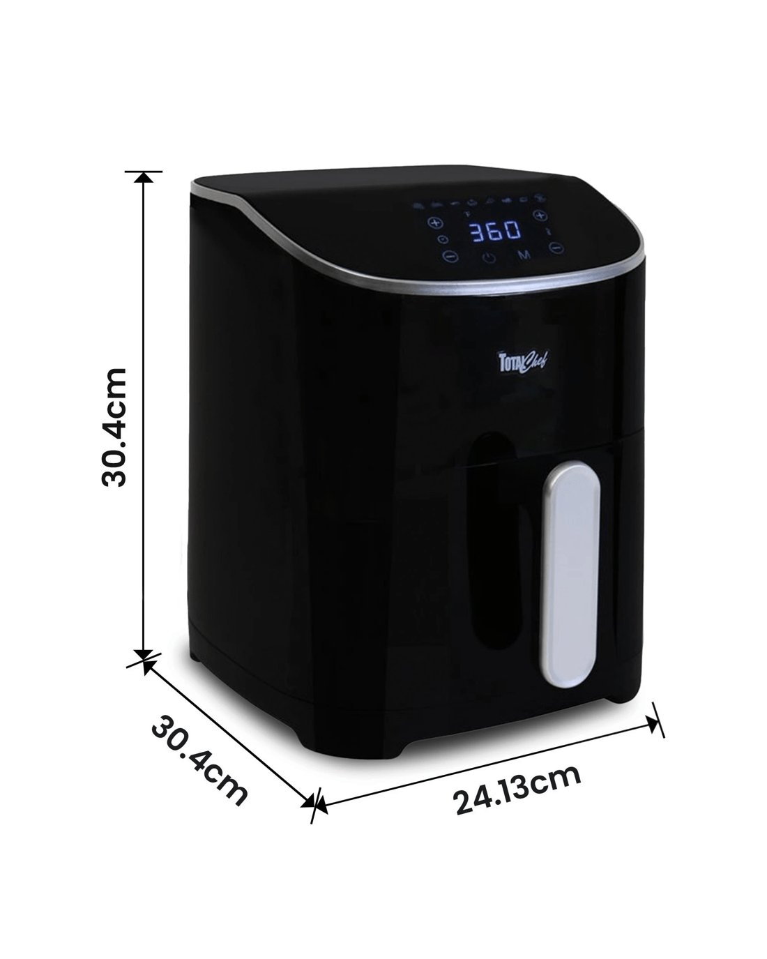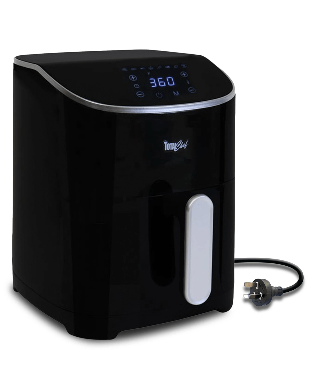 Air-fry, bake, grill, and roast in one versatile kitchen appliance: the total chef 8-in-1 digital air fryer is the perfect cooking tool for everyone from busy families to college students. This convenient countertop cooker uses rapid hot air circulation technology to cook from all directions, leaving your food crispy on the outside and juicy inside using little or no oil. Confidently fry, bake, grill, or roast with 8 pre-set cooking modes (fries, ribs, seafood, bake, chicken, beef and pork, fish, and reheat) or use the simple touchscreen controls to set the time and temperature manually. With a huge temperature range of 25-200c and an adjustable timer from 1-30 minutes with automatic shut-off, this electric oven can prepare healthy snacks and meals for the whole family. Plus, its compact profile and dishwasher-safe basket and grill plate make it the ideal all-in-one cooker for small kitchens, college dorms, or on the go in your rv. This product features an Australian rated plug. It is compatible with 220-240 VAC.