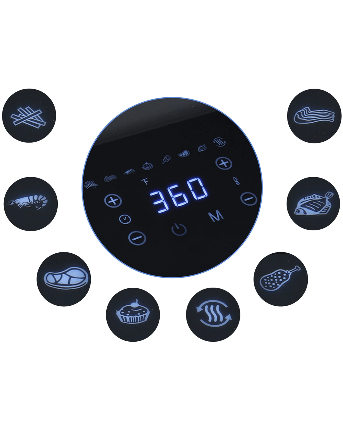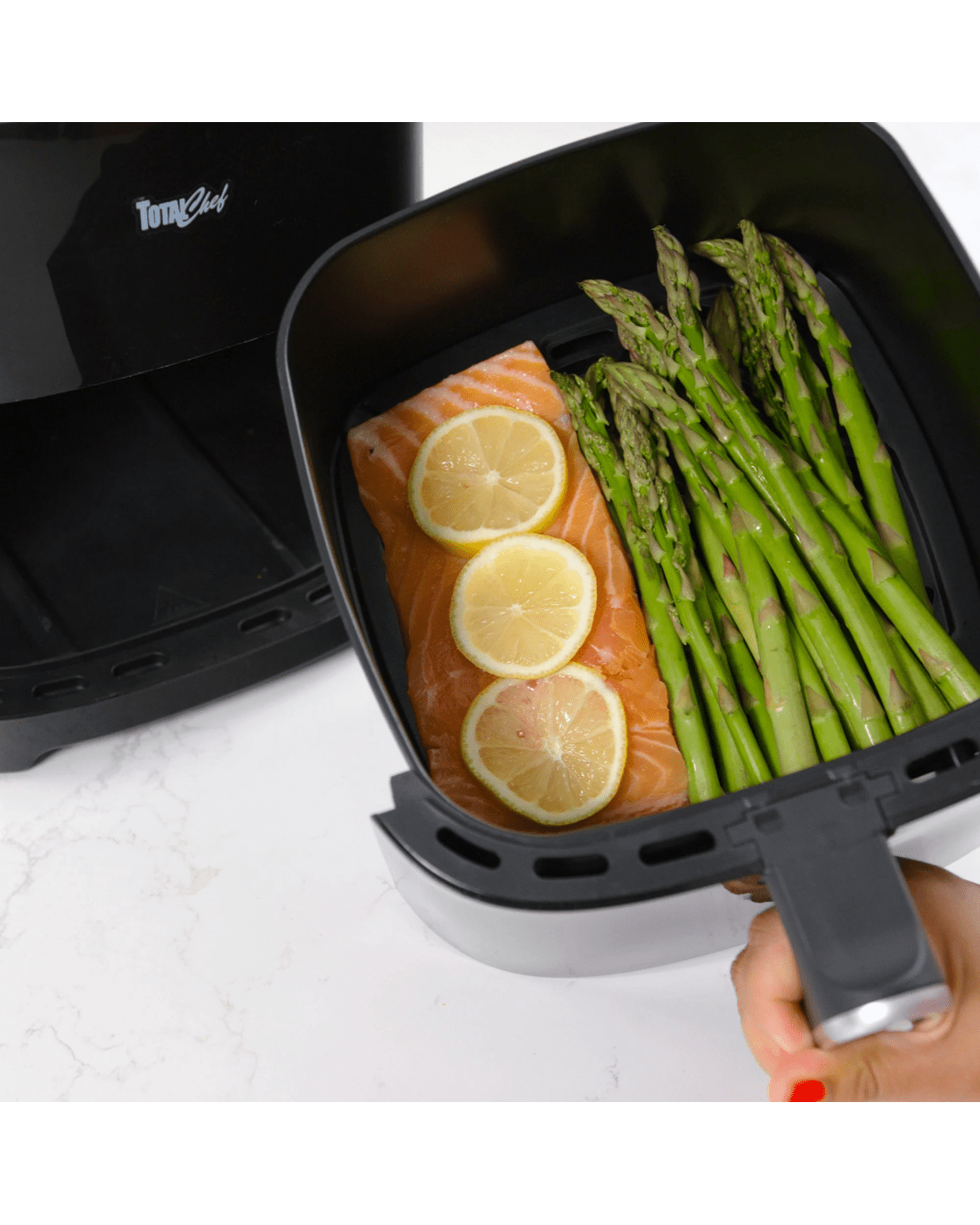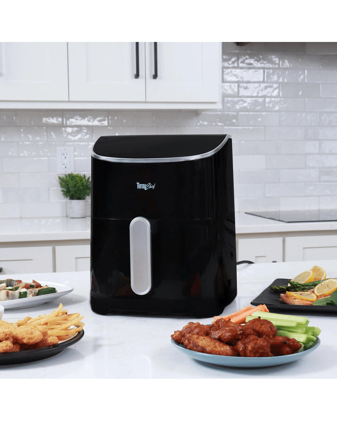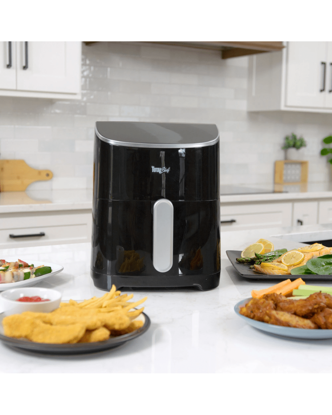 Air-fry, bake, grill, and roast in one versatile kitchen appliance: the total chef 8-in-1 digital air fryer is the perfect cooking tool for everyone from busy families to college students. This convenient countertop cooker uses rapid hot air circulation technology to cook from all directions, leaving your food crispy on the outside and juicy inside using little or no oil. Confidently fry, bake, grill, or roast with 8 pre-set cooking modes (fries, ribs, seafood, bake, chicken, beef and pork, fish, and reheat) or use the simple touchscreen controls to set the time and temperature manually. With a huge temperature range of 25-200c and an adjustable timer from 1-30 minutes with automatic shut-off, this electric oven can prepare healthy snacks and meals for the whole family. Plus, its compact profile and dishwasher-safe basket and grill plate make it the ideal all-in-one cooker for small kitchens, college dorms, or on the go in your rv. This product features an Australian rated plug. It is compatible with 220-240 VAC.