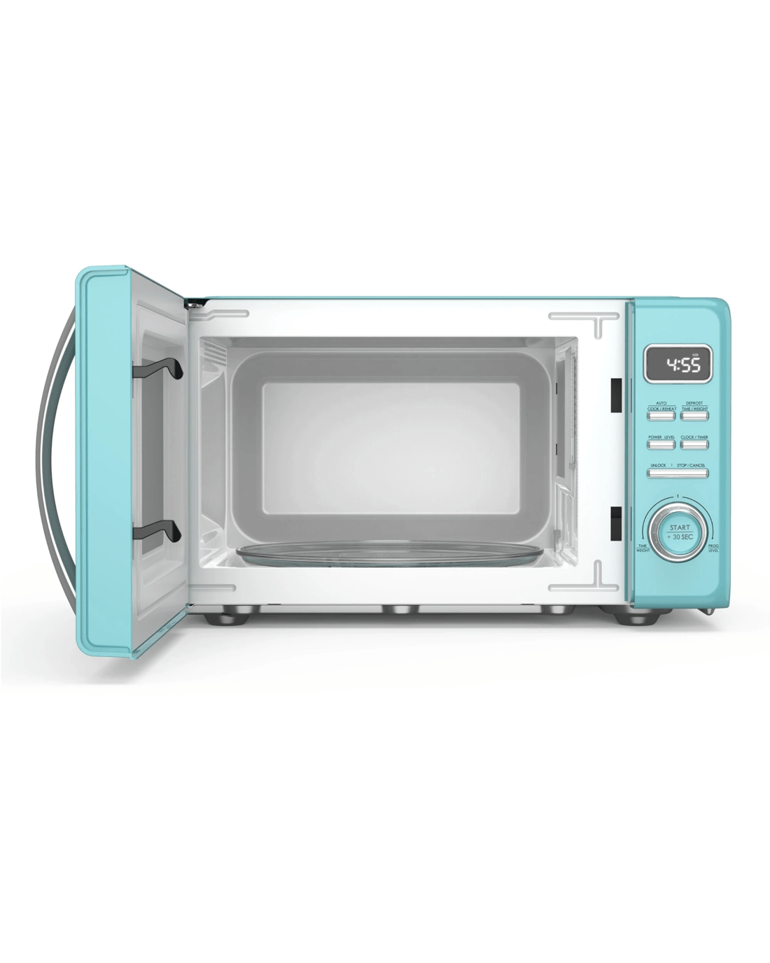 The vibrant blue exterior with chrome accents adds a stylish touch to any space, while the easy-clean design keeps maintenance simple. The removable glass turntable and roller ring rotate 360° for even heating and are dishwasher-safe for hassle-free cleanup.