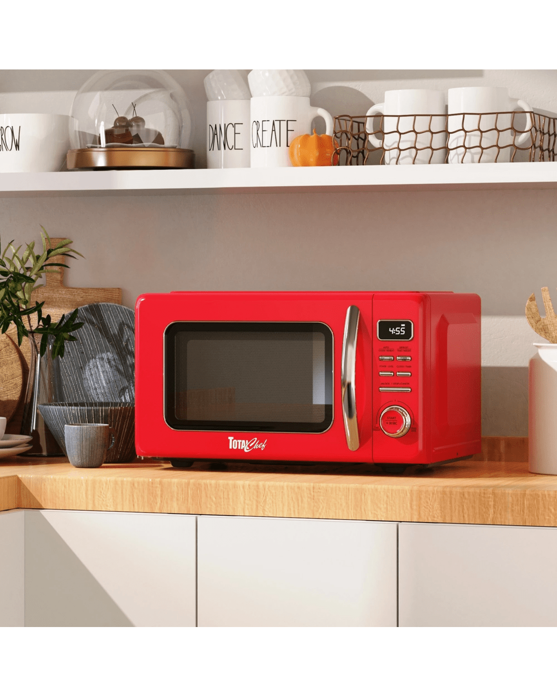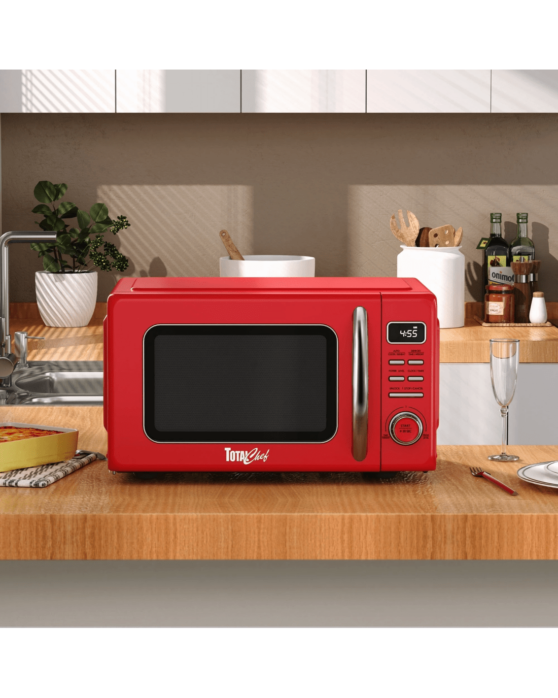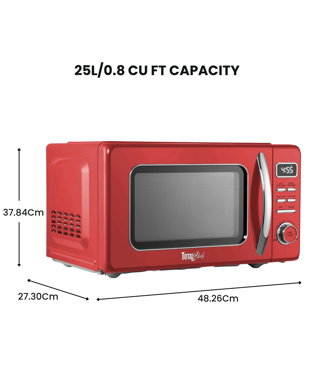 Bring a pop of retro charm to your kitchen with the Total Chef 25L Retro-Style Microwave Oven. This compact 24 Cm. countertop microwave combines vintage design with modern performance, making it ideal for apartments, offices, cottages, and dorm rooms.