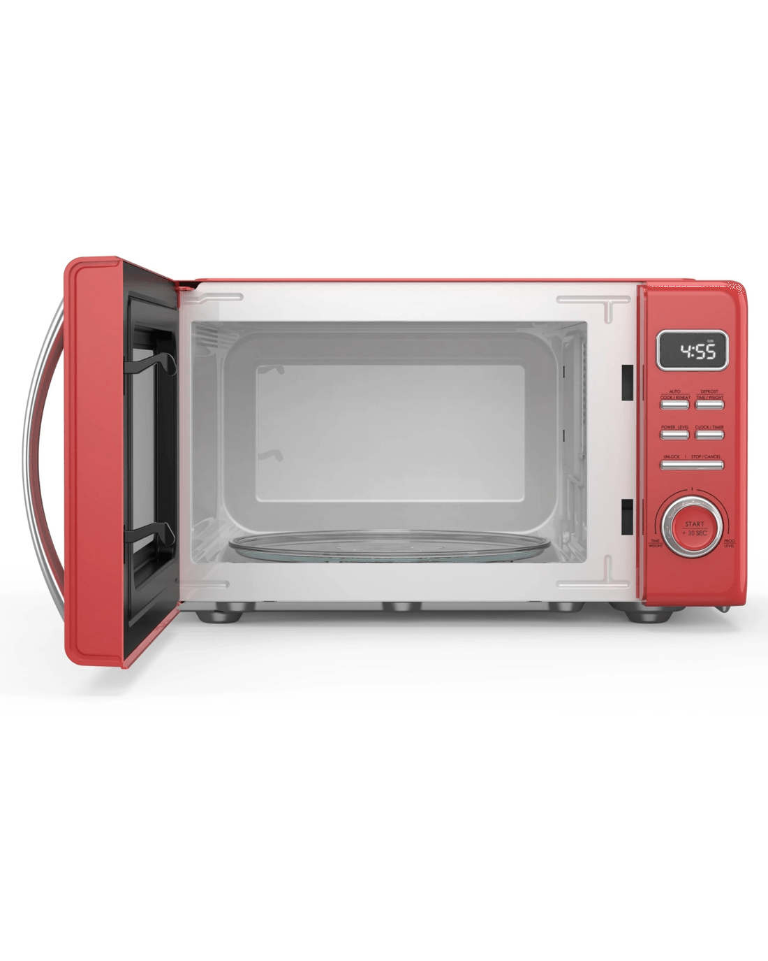 The vibrant blue exterior with chrome accents adds a stylish touch to any space, while the easy-clean design keeps maintenance simple. The removable glass turntable and roller ring rotate 360° for even heating and are dishwasher-safe for hassle-free cleanup.