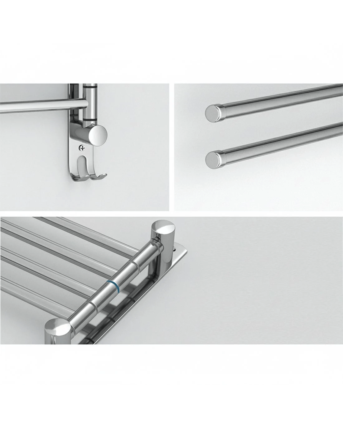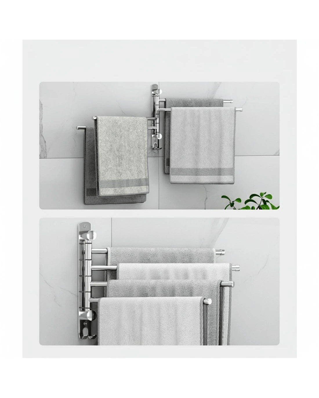 Give your bathroom a glossy makeover with the new sleek and functional Towel Rack. Crafted with quality stainless steel, the rack is rust and corrosion-resistant to ensure long-lasting use. Designed with convenience in mind, the four rungs can swivel up to 180 degrees to easily adjust to your desired position. The rack features an anti-drop design to keep clothes and towels in place, while anti-noise silicone gaskets keep the rack silent. An extra hanging hook helps you hang additional towels and clothes. With its easy installation process, this elegant storage solution is perfect for your bathroom, kitchen or laundry room. Upgrade your space and enjoy a clutter-free bathroom with our Towel Rack.