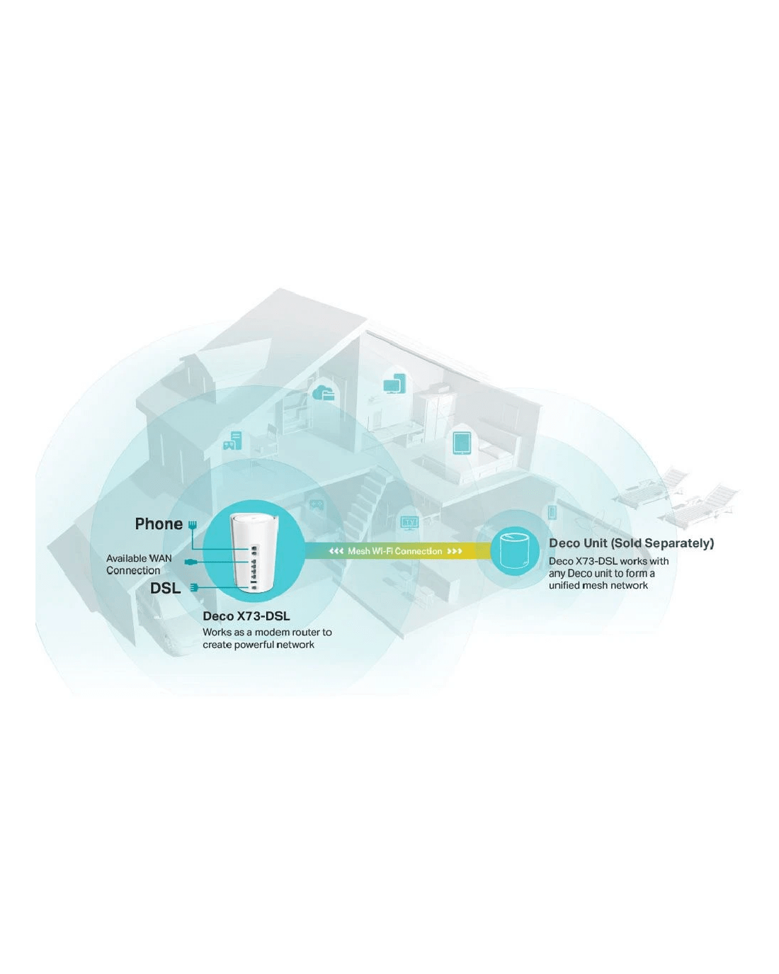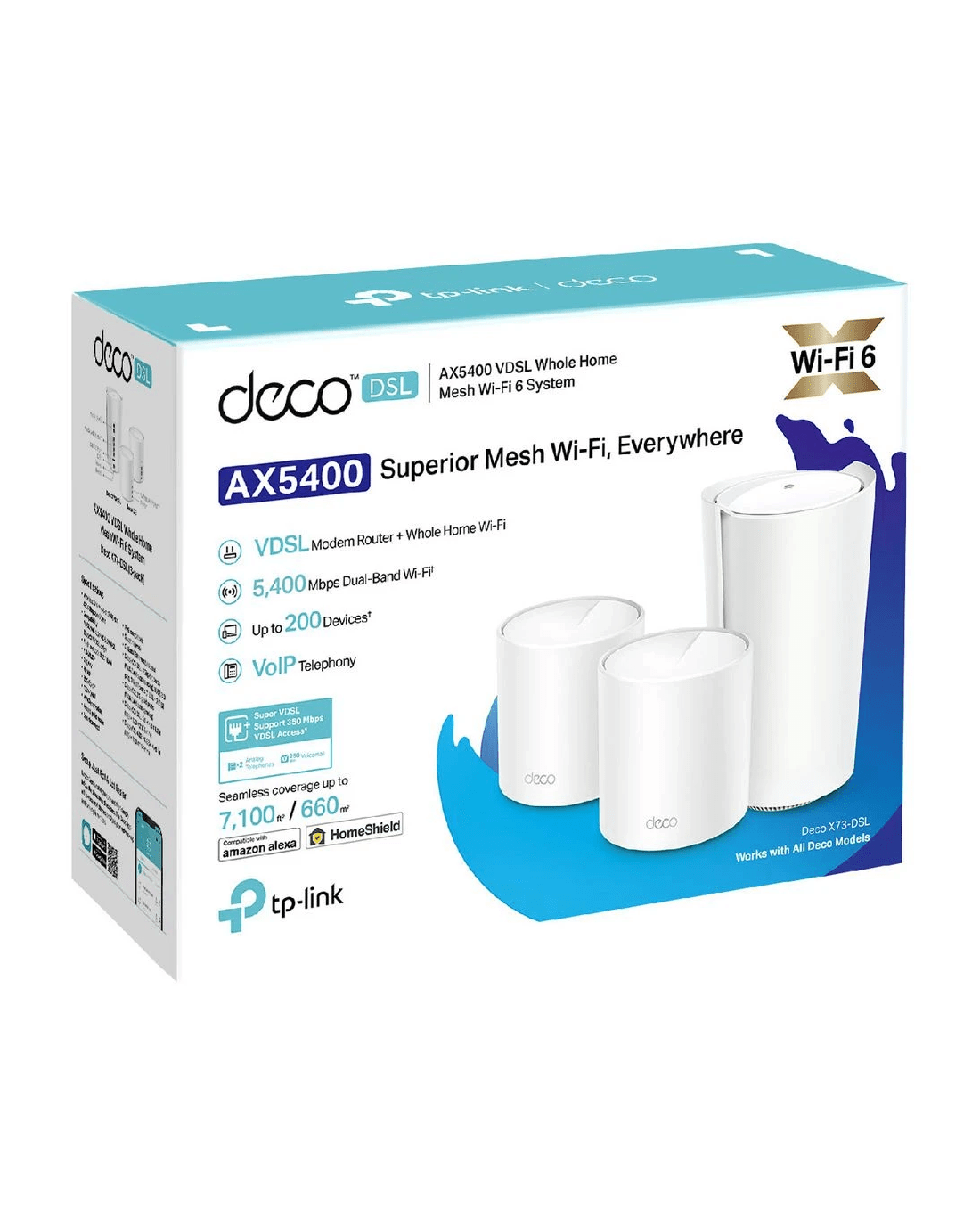 This 3-pack of TP-Link Deco AX5400 WiFi 6 Modem Routers is designed to deliver your network a huge boost in coverage, speed and total capacity. Each device functions as both a VDSL Modem and Mesh WiFi router, offering impressive, super VDSL2 speeds and a true seamless roaming WiFi 6 experience, allowing you to walk through your home and stay connected to the fastest possible speed. Plus, with TP-Link HomeShield you will be able to use personalised features such as parental controls to ensure a safer online experience.