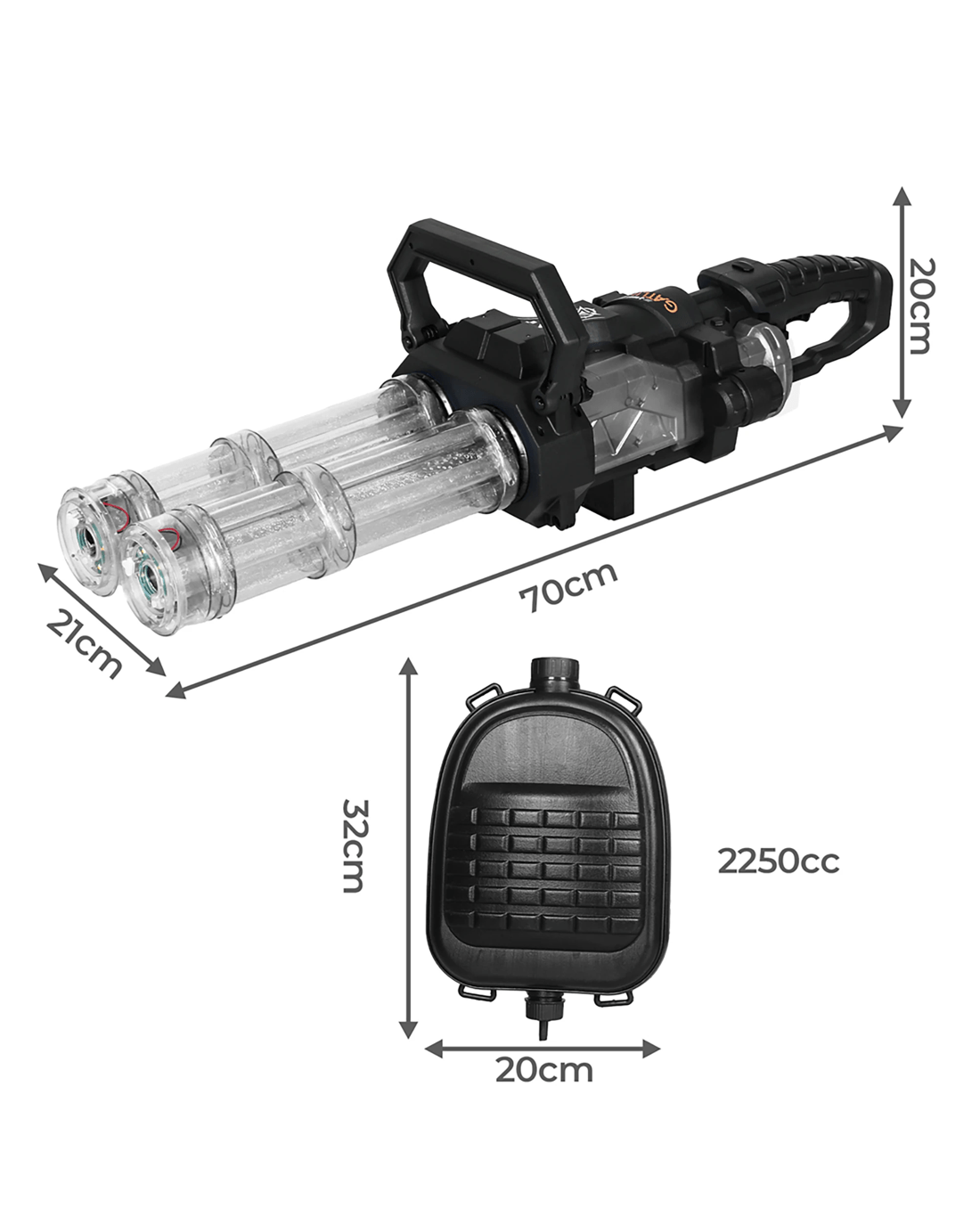 Water gun dimensions(L x W x H): 70cm x 21cm x 20cm