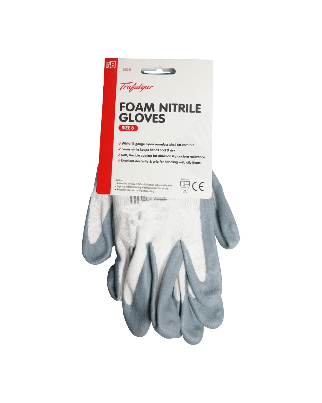 Protect yourself in complete comfort and dexterity using these Trafalgar Foam Nitrile Gloves. They're suitable for electricians, assembly workers, miners, those working in agriculture and more. They protect your skin from germs, abrasions and contamination thanks to the 13 gauge nylon shell and foam nitrile construction.