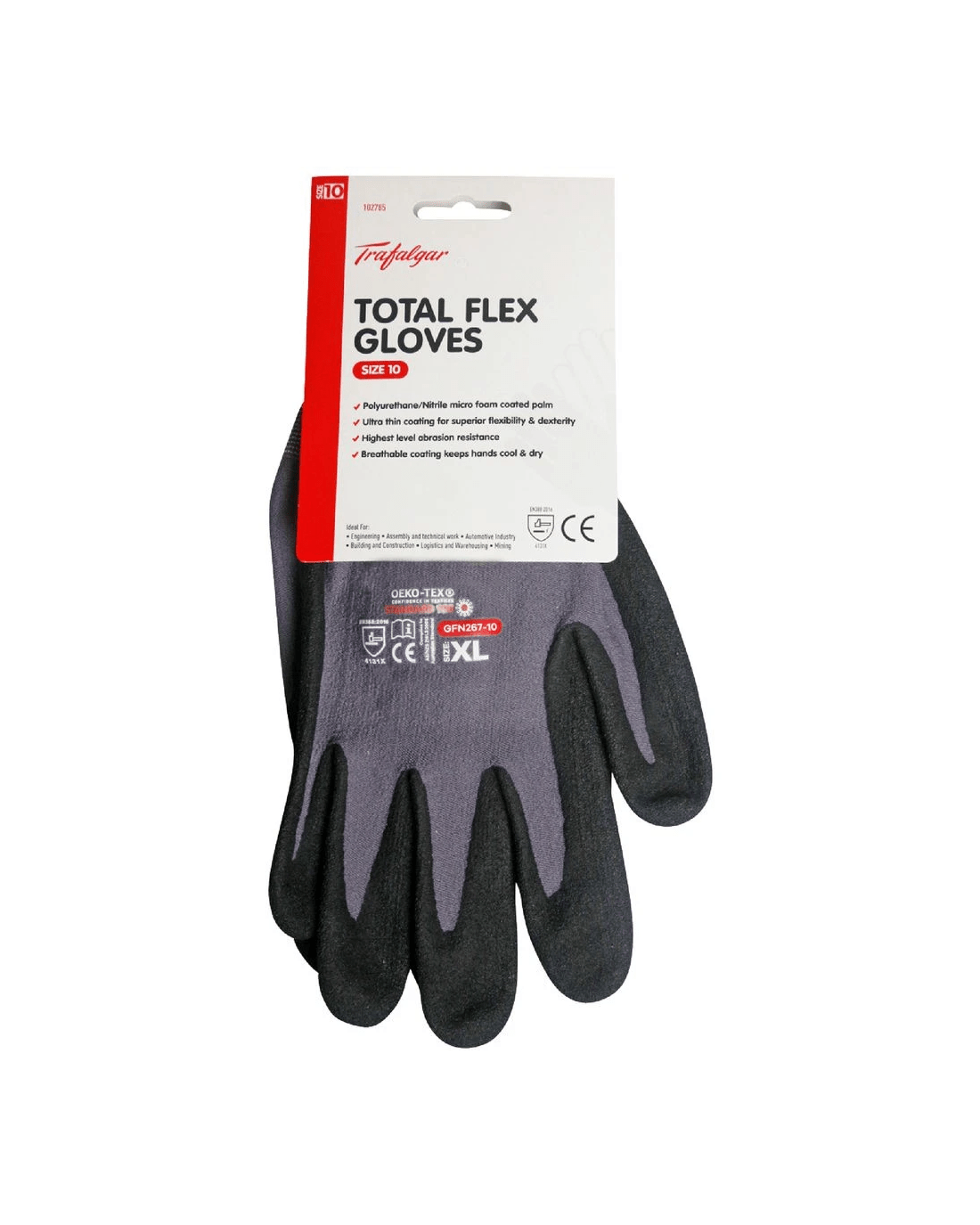 These Trafalgar Total Flex Gloves offer industry level flexibility and dexterity thanks to the ultra-thin coating. They're suitable for industry use like, precision assembly work, general handling, engineering, assembly and technical work, automotive industry, building and construction, logistics and warehousing, mining and electrical work. They protect your skin from germs, abrasions and contamination thanks OEKO-TEX certification.