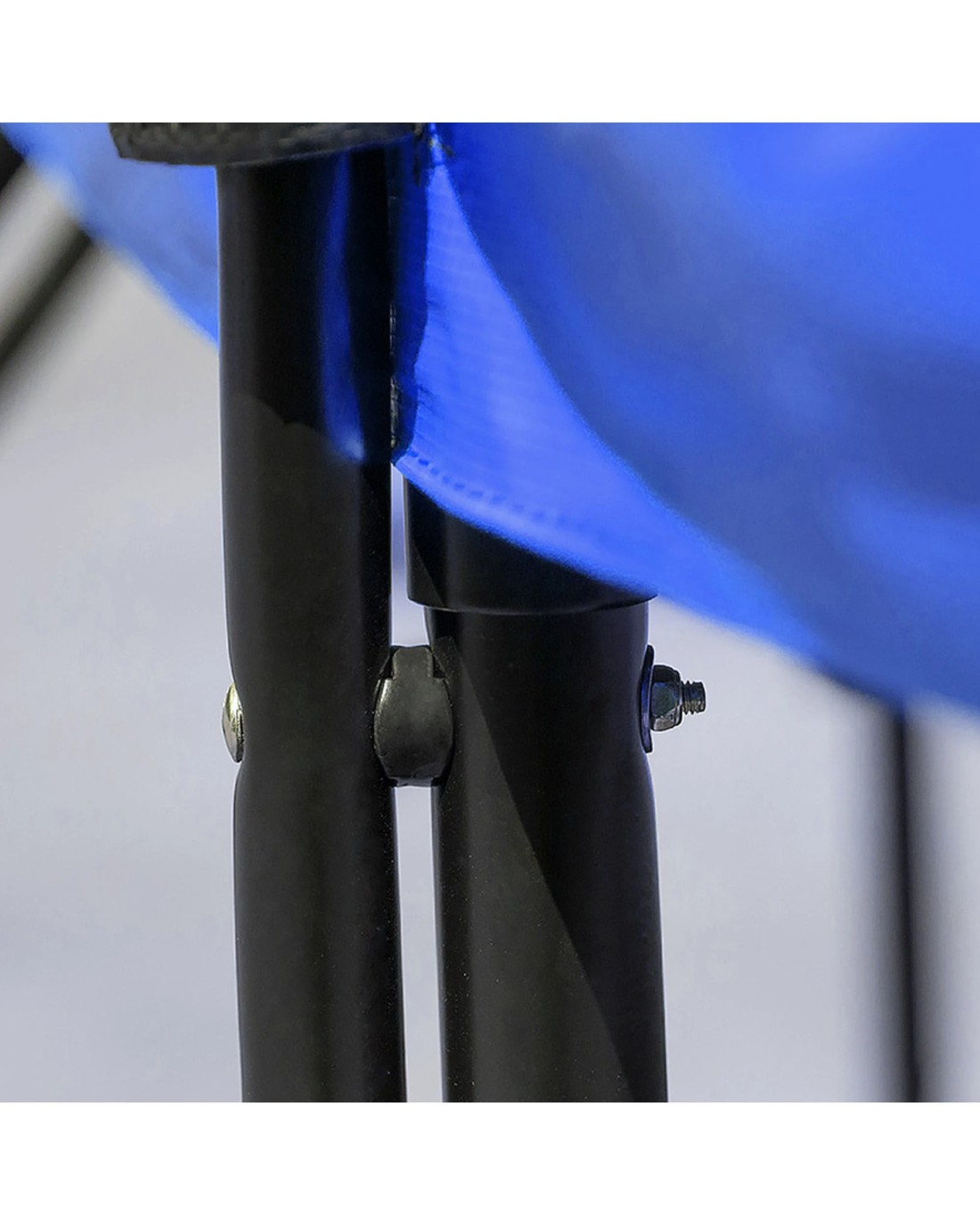 This is a heavy trampoline and uses linked legs and grounding straps for superior stability. The structure of the legs also minimises the tendency for legs to dig into the ground.