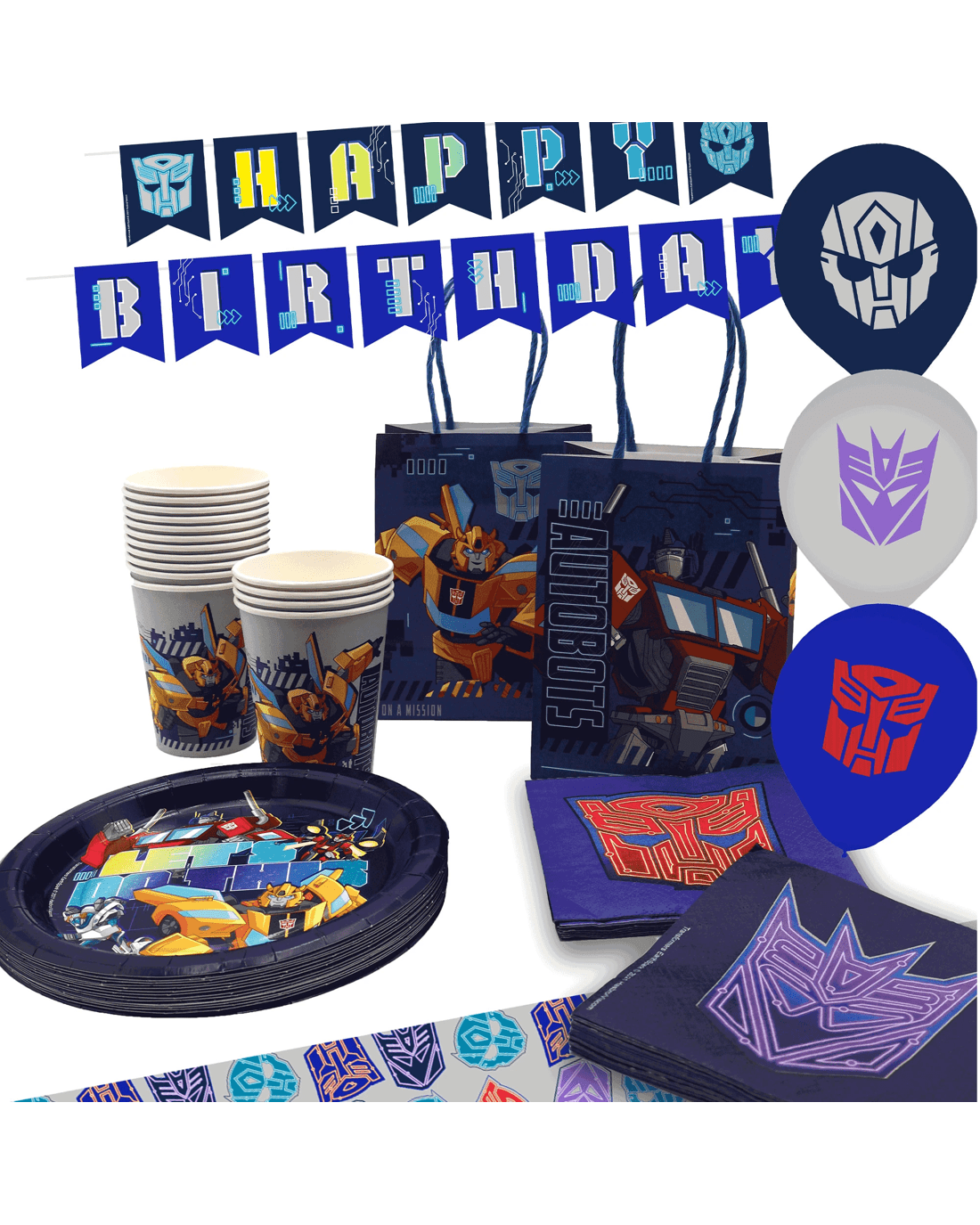 - Includes 32 x Transformers napkins, 16 Transformers paper cups, 16 x Transformers paper plates, 1 x Transformers banner, 1 x Transformers tablecover, 6 x Transformers latex balloons and 16 x Transformers kraft bags