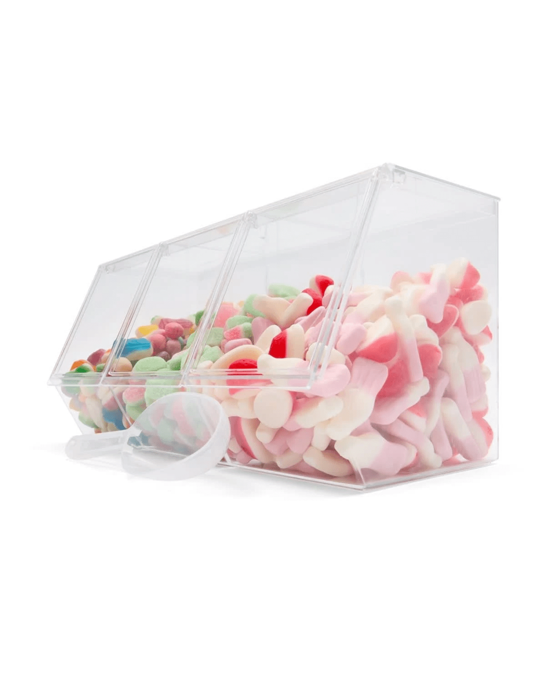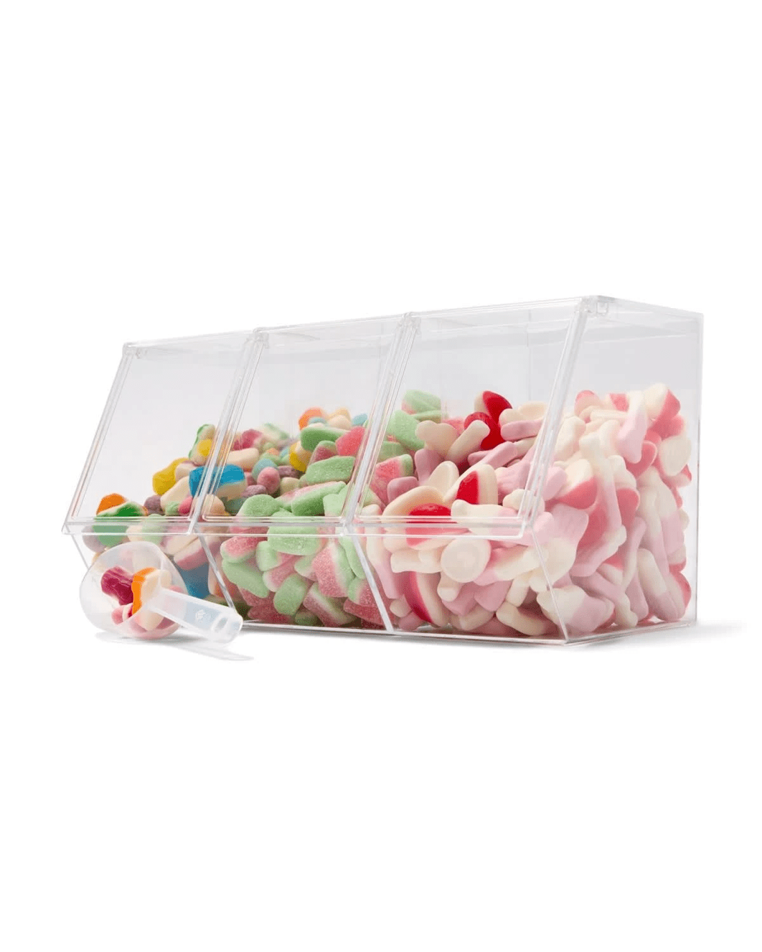 Make party treats easy and fun with the Trio Scoop Candy Bar - a three-compartment scoop designed for serving sweets, snacks, or toppings, perfect for candy buffets, dessert tables and celebration spreads.